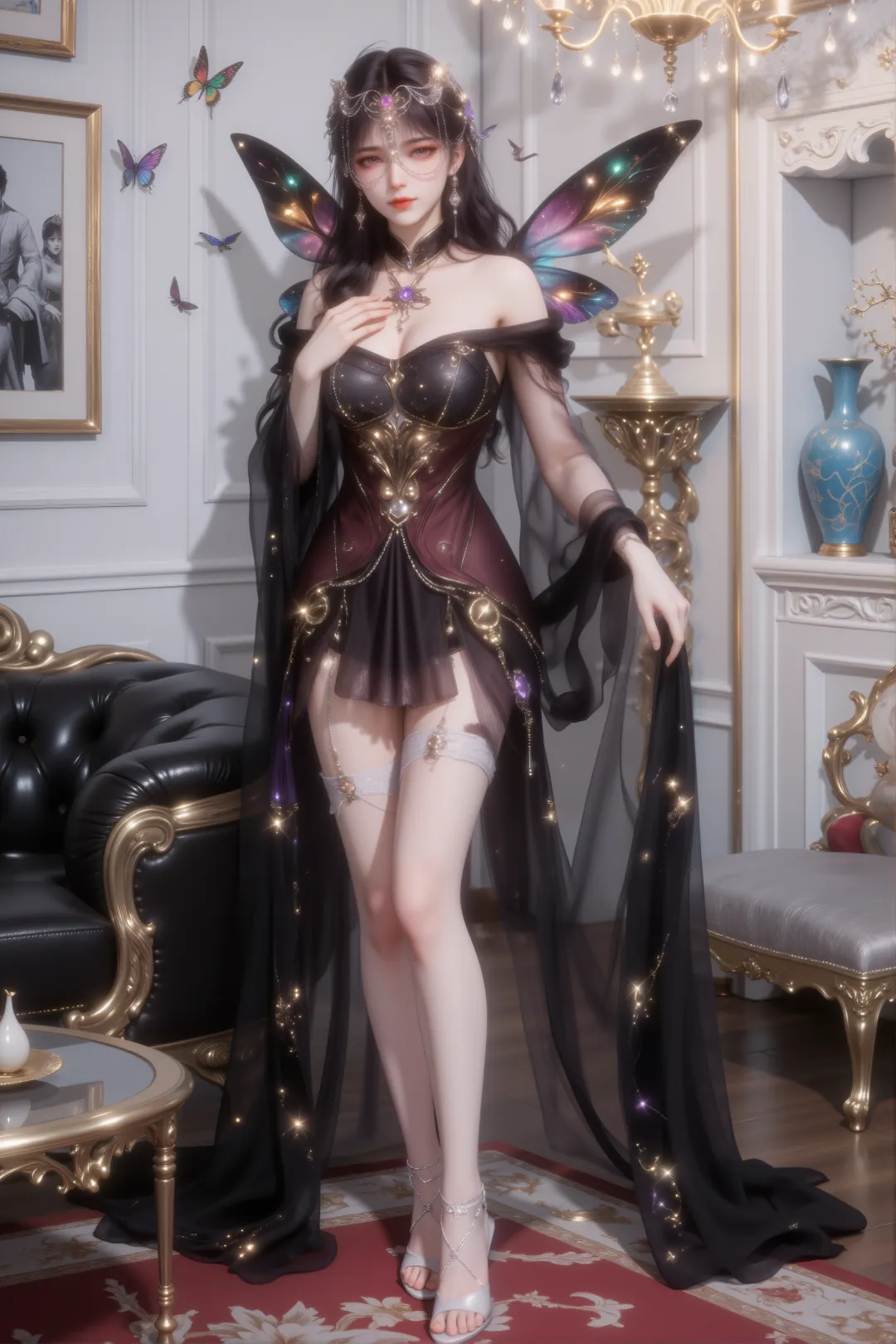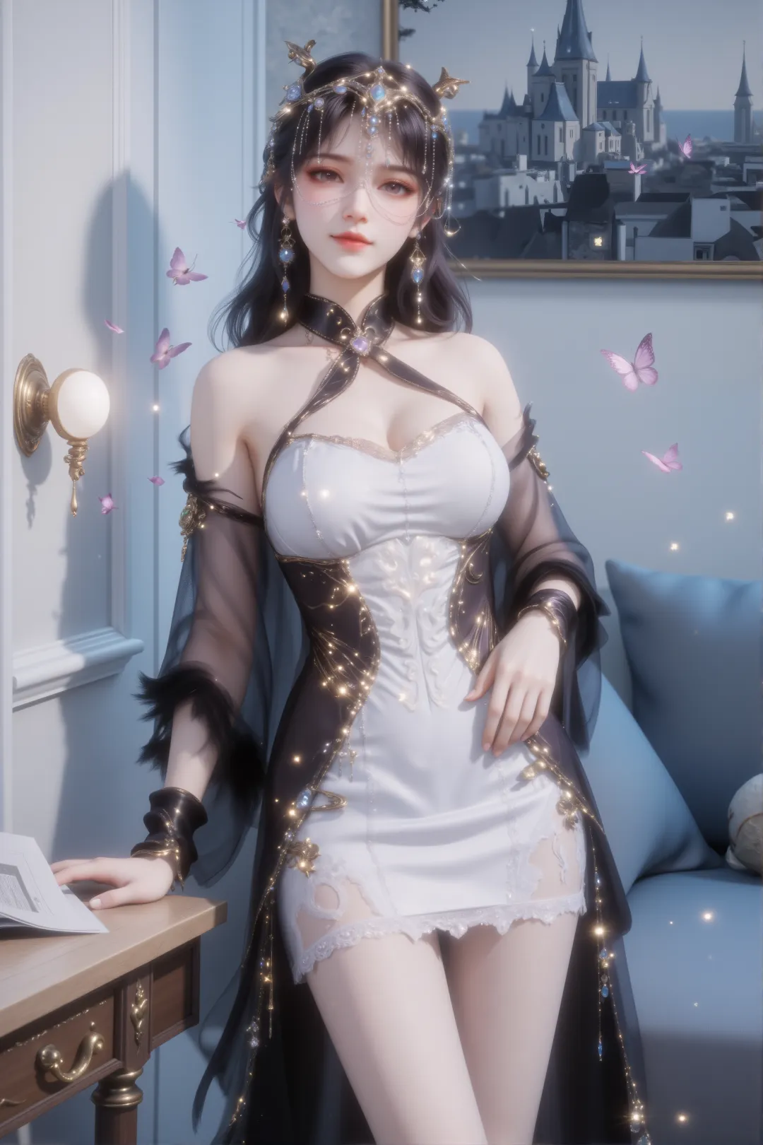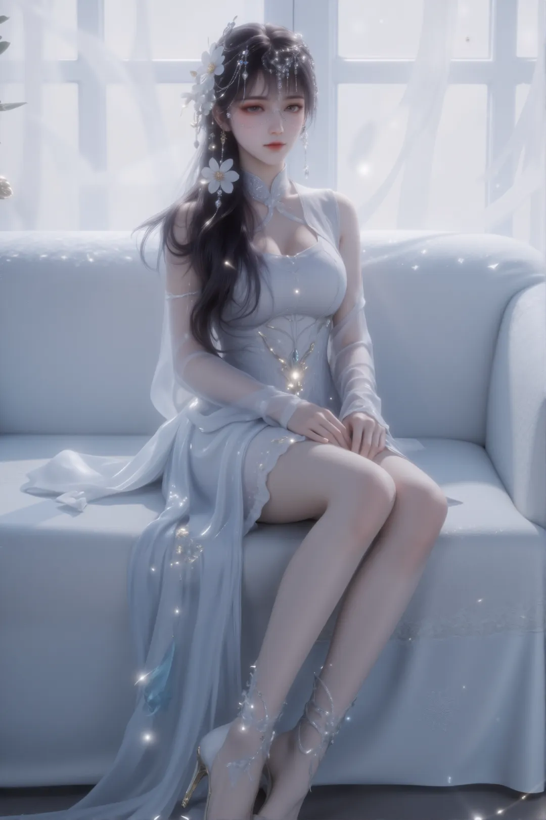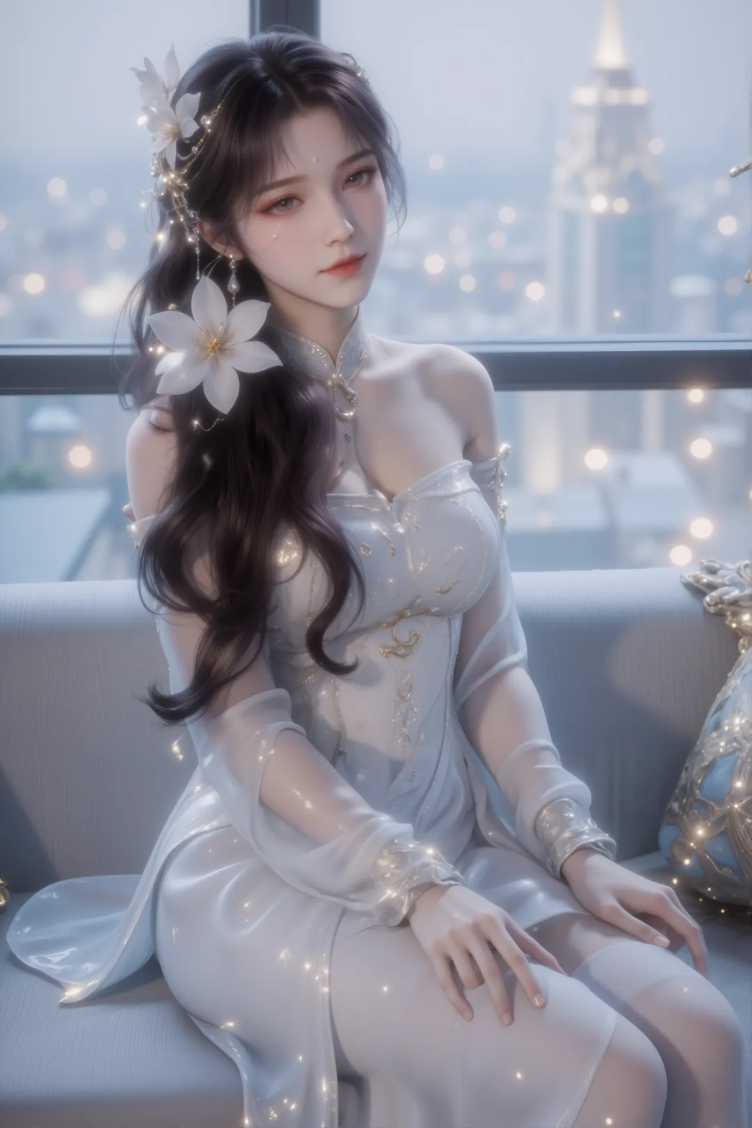 她坐在一张浅灰色的沙发上,姿态优雅放松,一只手轻搭在腿上,另一只手自然垂放,身旁还有一个带有金色花纹与光点的精致抱枕,进一步提升了画面的奢华与梦幻感。