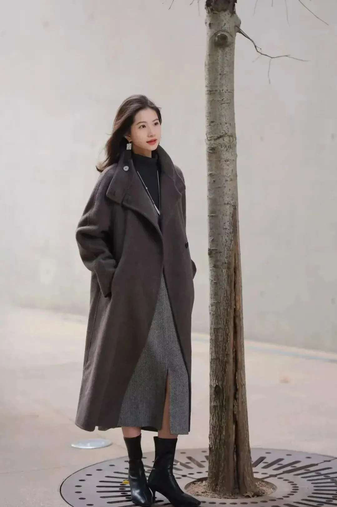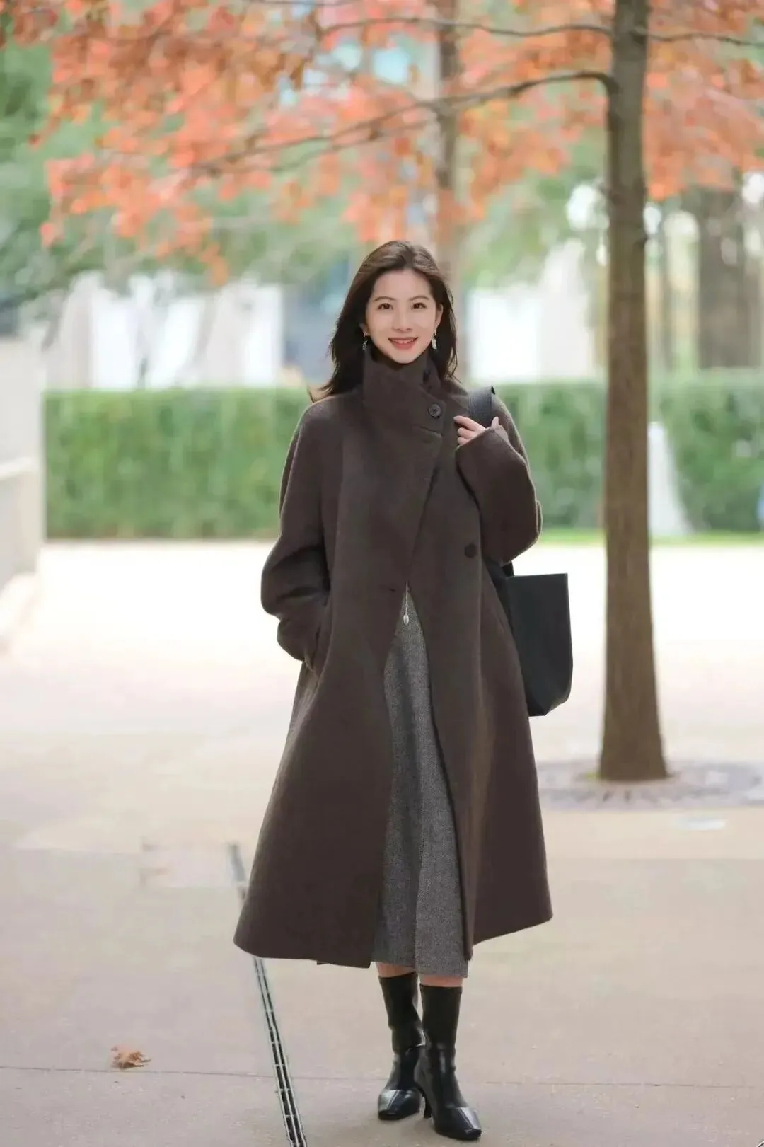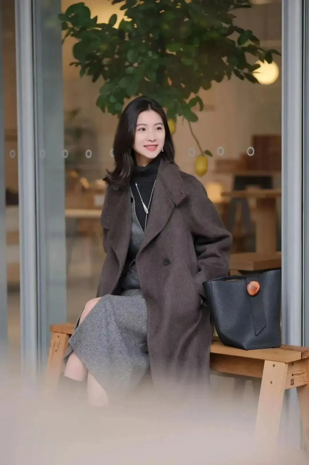 穿搭上,建议内搭选择灰色针织裙,同色系深浅过渡高级又耐看。鞋子搭配黑色短靴,利落显瘦。包包选择黑色托特包,容量大又有型。妆容保持干净,口红选豆沙色或红棕色,提升气色又不突兀。