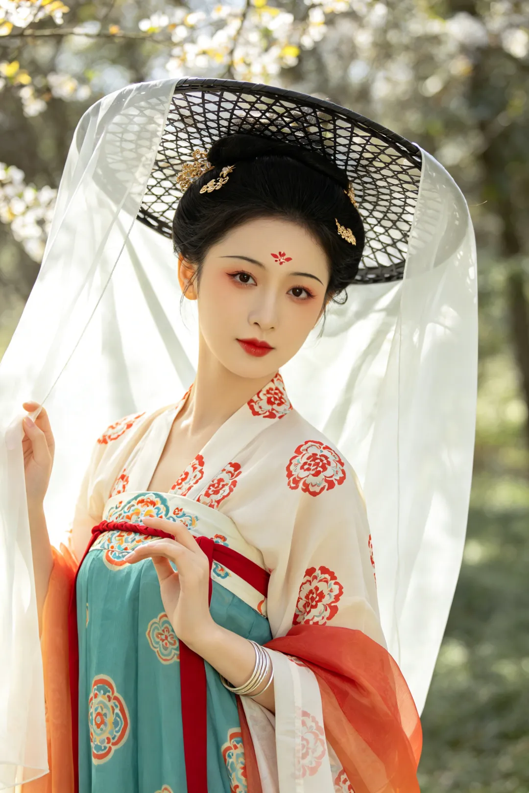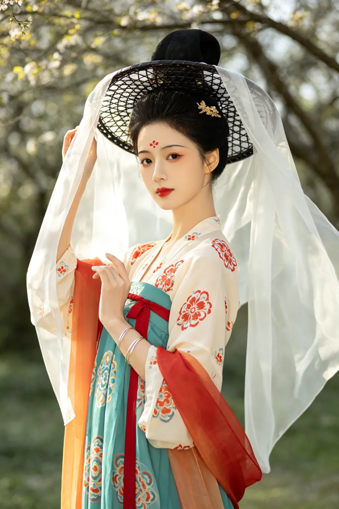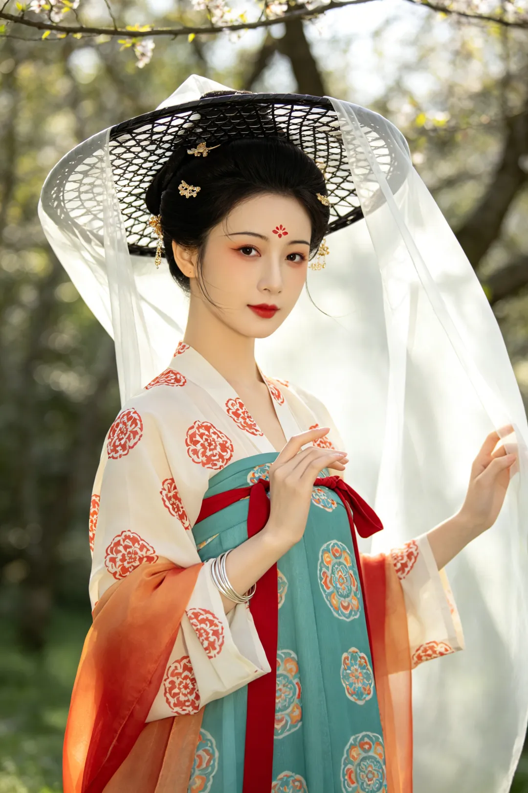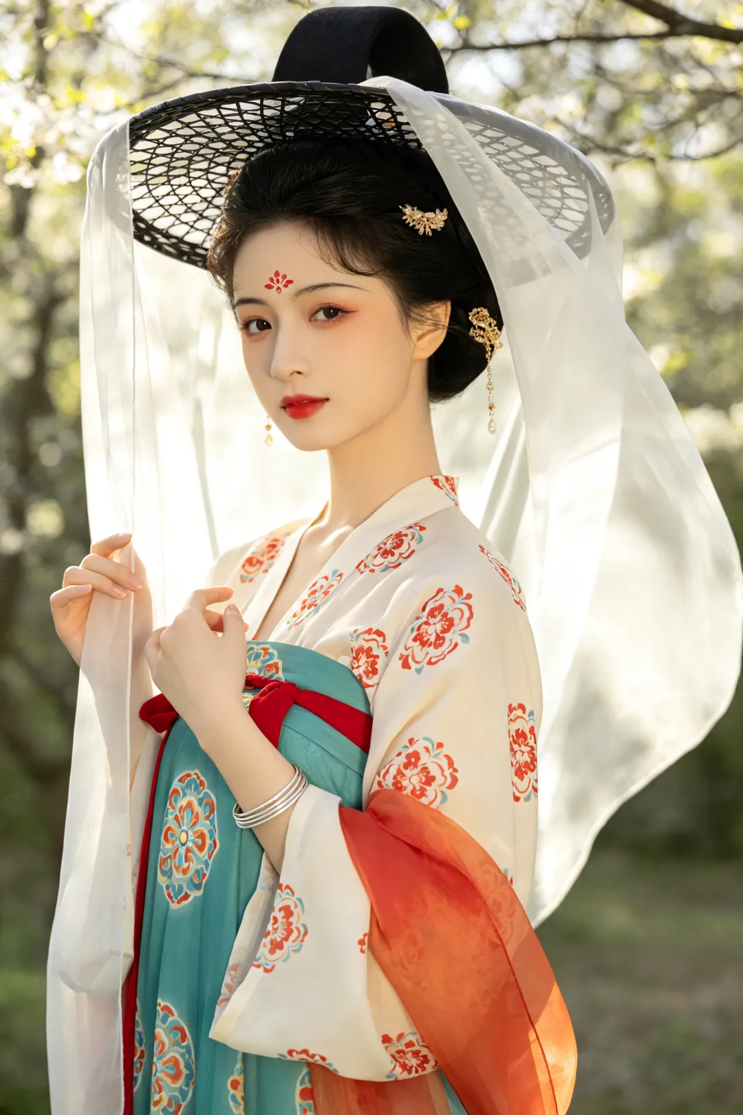 帮我生成图片:大师级作品,最佳画质,8K超高清,超细节,真实人像摄影,专业古风写真, 1位20岁左右的东亚年轻女性,鹅蛋脸,精致五官,白皙通透的皮肤,清透伪素颜妆容,温婉古典气质, 唐代妆容:额间红色花钿,红调眼妆,柳叶眉,朱红唇, 唐代高发髻,搭配精致金色发簪发饰, 头戴黑色编织宽檐帷帽(幕篱),白色半透明纱幔垂落,随风轻扬, 身着唐代齐胸襦裙:米白色交领上襦,印红色花卉团花图案,袖口渐变橘红色,青绿色齐胸下裙,配红色腰封,裙身印彩色团花纹样, 佩戴多层银色细手镯, 侧身站立在春日户外树林中,一手轻扶纱幔,一手轻抬于胸前,温柔看向镜头,神态娴静优雅, 柔和漫射光,丁达尔效应,大光圈虚化背景,电影感氛围,日系清新森系风格, 复古胶片色调,氛围感拉满,构图精美,主体突出,发丝清晰,皮肤质感通透,细节拉满