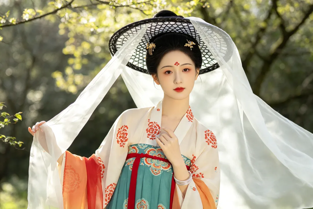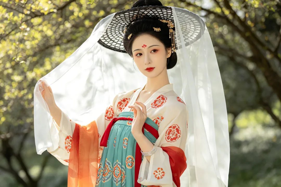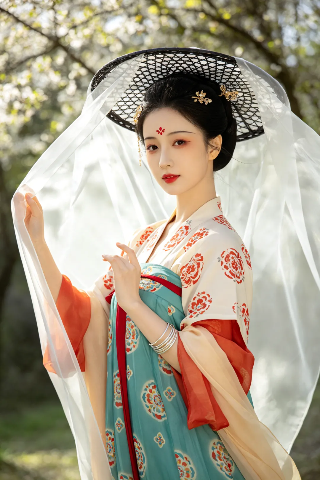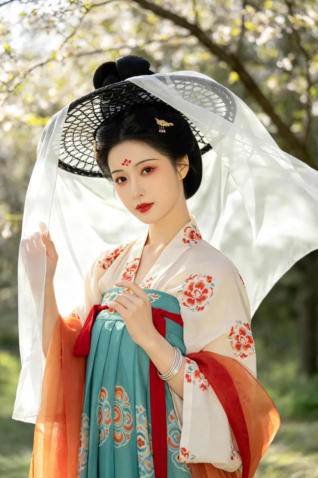 帮我生成图片:大师级作品,最佳画质,8K超高清,超细节,真实人像摄影,专业古风写真, 1位20岁左右的东亚年轻女性,鹅蛋脸,精致五官,白皙通透的皮肤,清透伪素颜妆容,温婉古典气质, 唐代妆容:额间红色花钿,红调眼妆,柳叶眉,朱红唇, 唐代高发髻,搭配精致金色发簪发饰, 头戴黑色编织宽檐帷帽(幕篱),白色半透明纱幔垂落,随风轻扬, 身着唐代齐胸襦裙:米白色交领上襦,印红色花卉团花图案,袖口渐变橘红色,青绿色齐胸下裙,配红色腰封,裙身印彩色团花纹样, 佩戴多层银色细手镯, 侧身站立在春日户外树林中,一手轻扶纱幔,一手轻抬于胸前,温柔看向镜头,神态娴静优雅, 柔和漫射光,丁达尔效应,大光圈虚化背景,电影感氛围,日系清新森系风格, 复古胶片色调,氛围感拉满,构图精美,主体突出,发丝清晰,皮肤质感通透,细节拉满