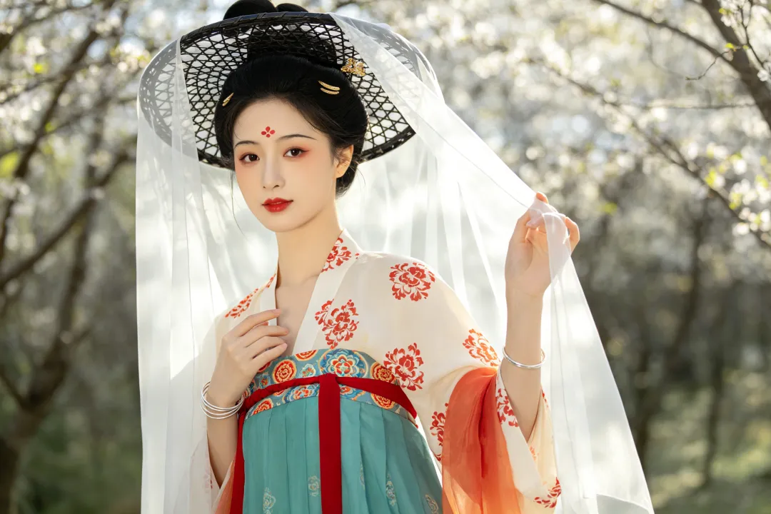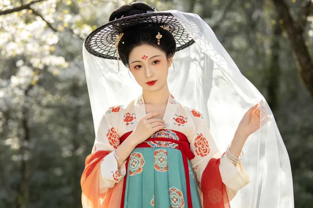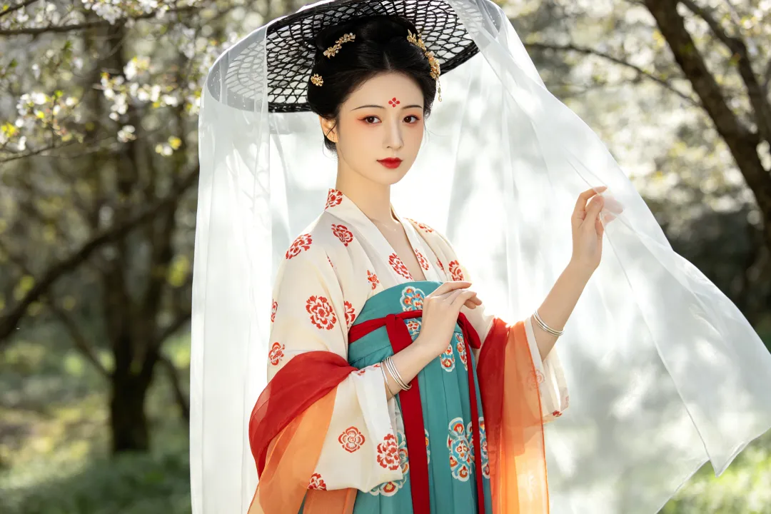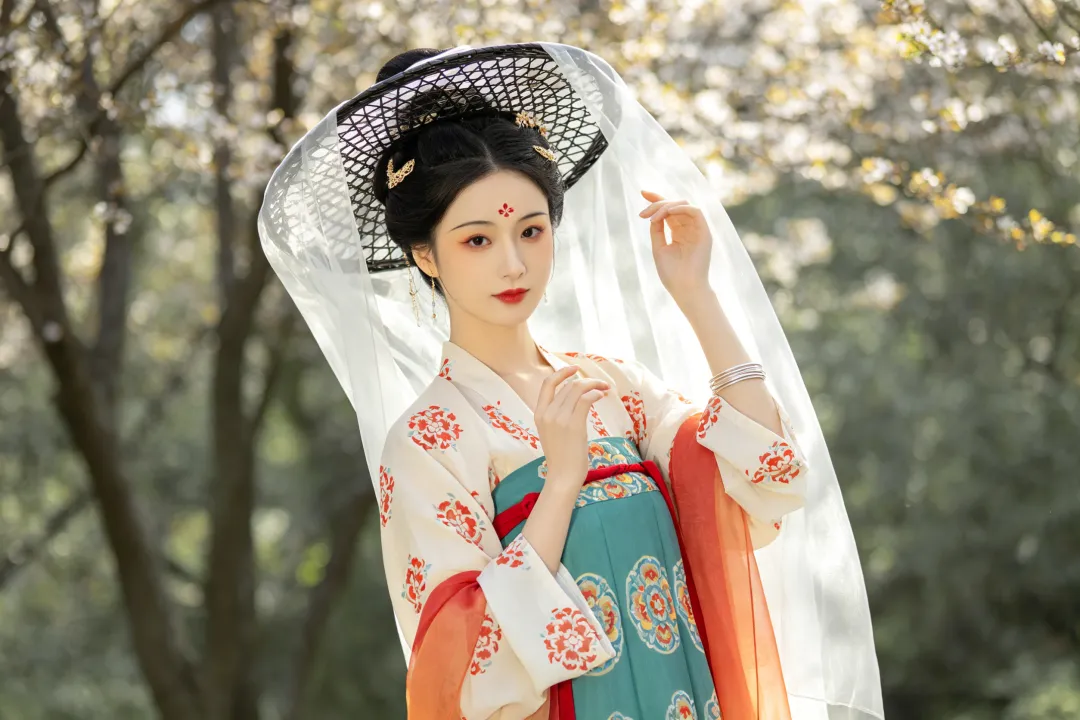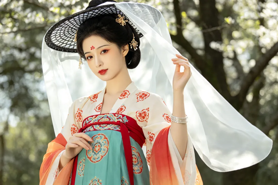 帮我生成图片:大师级作品,最佳画质,8K超高清,超细节,真实人像摄影,专业古风写真, 1位20岁左右的东亚年轻女性,鹅蛋脸,精致五官,白皙通透的皮肤,清透伪素颜妆容,温婉古典气质, 唐代妆容:额间红色花钿,红调眼妆,柳叶眉,朱红唇, 唐代高发髻,搭配精致金色发簪发饰, 头戴黑色编织宽檐帷帽(幕篱),白色半透明纱幔垂落,随风轻扬, 身着唐代齐胸襦裙:米白色交领上襦,印红色花卉团花图案,袖口渐变橘红色,青绿色齐胸下裙,配红色腰封,裙身印彩色团花纹样, 佩戴多层银色细手镯, 侧身站立在春日户外树林中,一手轻扶纱幔,一手轻抬于胸前,温柔看向镜头,神态娴静优雅, 柔和漫射光,丁达尔效应,大光圈虚化背景,电影感氛围,日系清新森系风格, 复古胶片色调,氛围感拉满,构图精美,主体突出,发丝清晰,皮肤质感通透,细节拉满