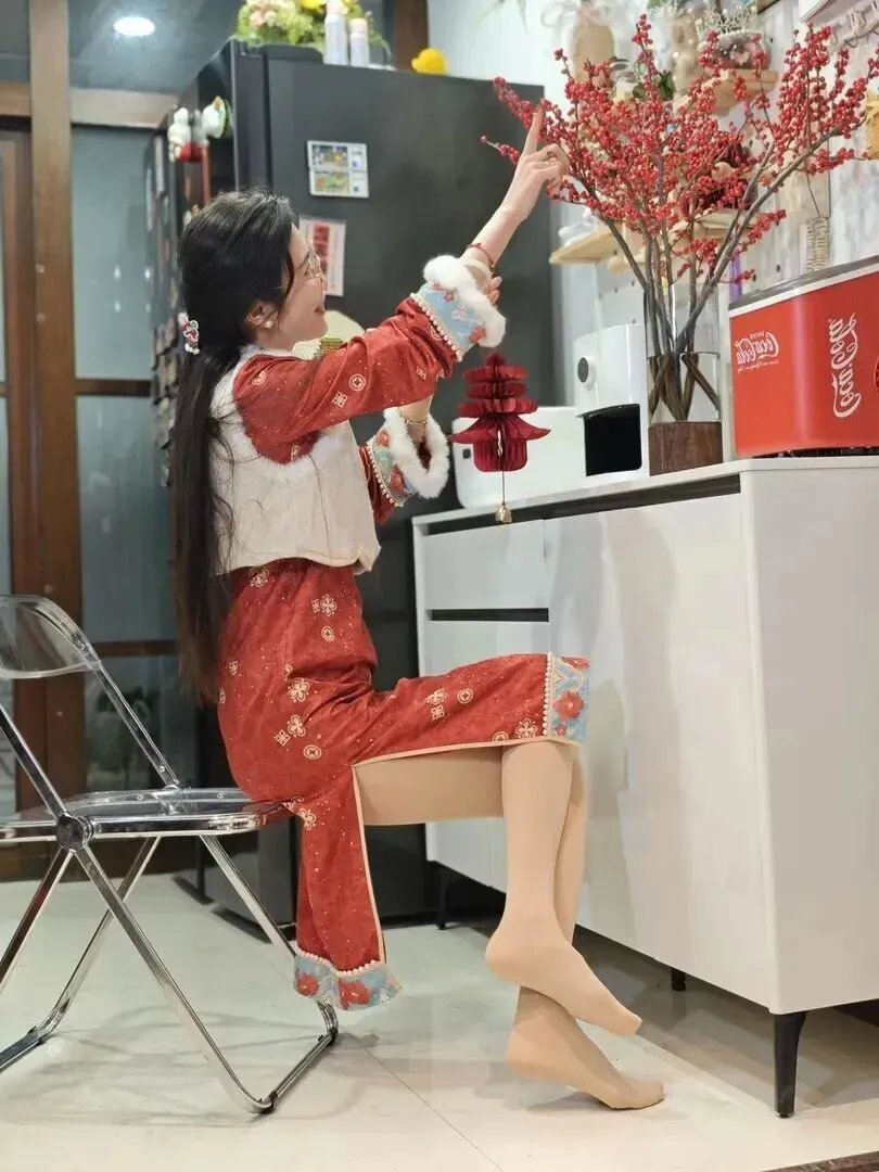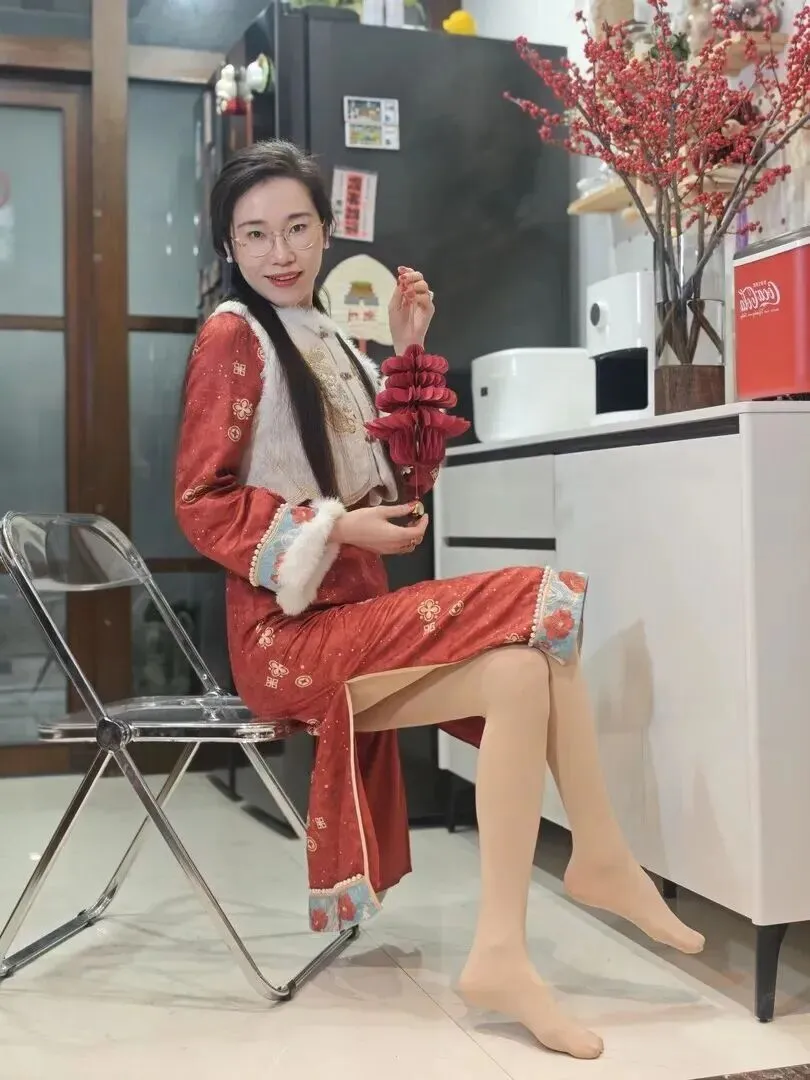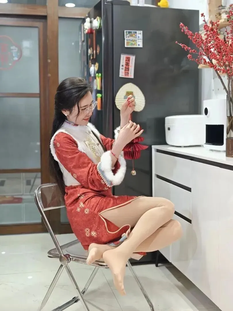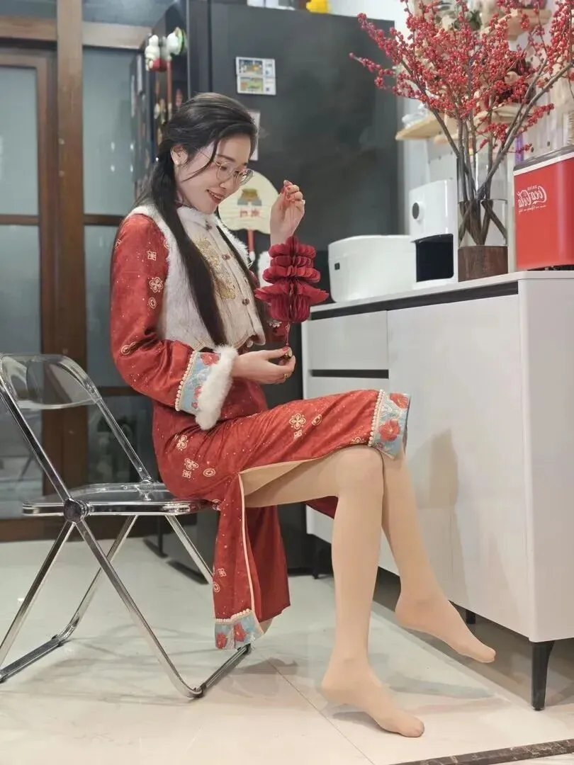 拿一个红色折纸小灯笼同旗袍的色彩相呼应。灯笼小巧可爱,非常可爱。她低头摆弄的样子,就像在精心筹备过年装饰。