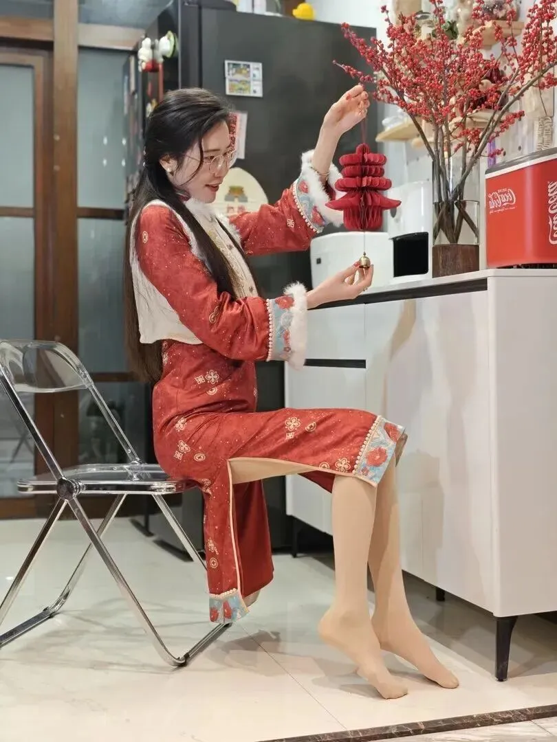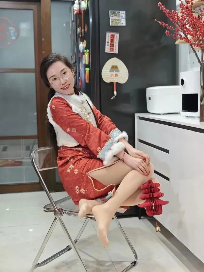 旗袍的开叉处露出腿部线条,不显摆地展示出来。她穿着肤色光腿神器,并不是假白的。走动时非常灵活,不会显得生硬。