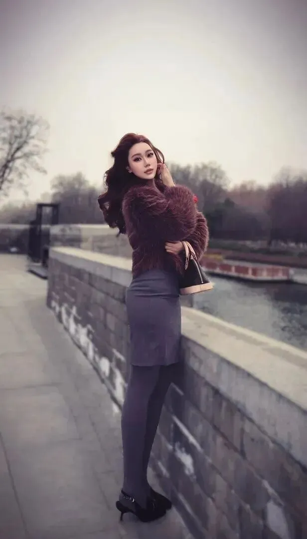 你看这张,她站在桥洞下面,光线从侧面照射进来,她的毛绒绒的外套质感就立刻凸显了出来。我最喜欢她穿的深灰色包臀裙,虽然是很基础的款式,但是和高腰一起使用的时候,就立马拉长了比例。但她没有选择那些亮闪闪的配饰,只用了LV一个老花包,但复古的氛围被她营造了出来。有时候穿搭并不需要堆积太多的元素,只要找准了重点,整个人就会自带滤镜。