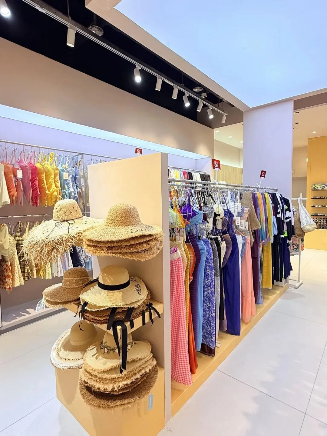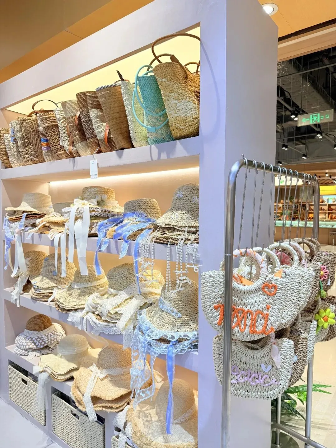 最后别忘了拍店里的配饰区,草帽,编织包,丝带这些东西特别适合收尾,镜头可以稍微靠近一点,把帽檐,蝴蝶结和包的编织纹理拍进去,右边带一点挂架边框就够了,