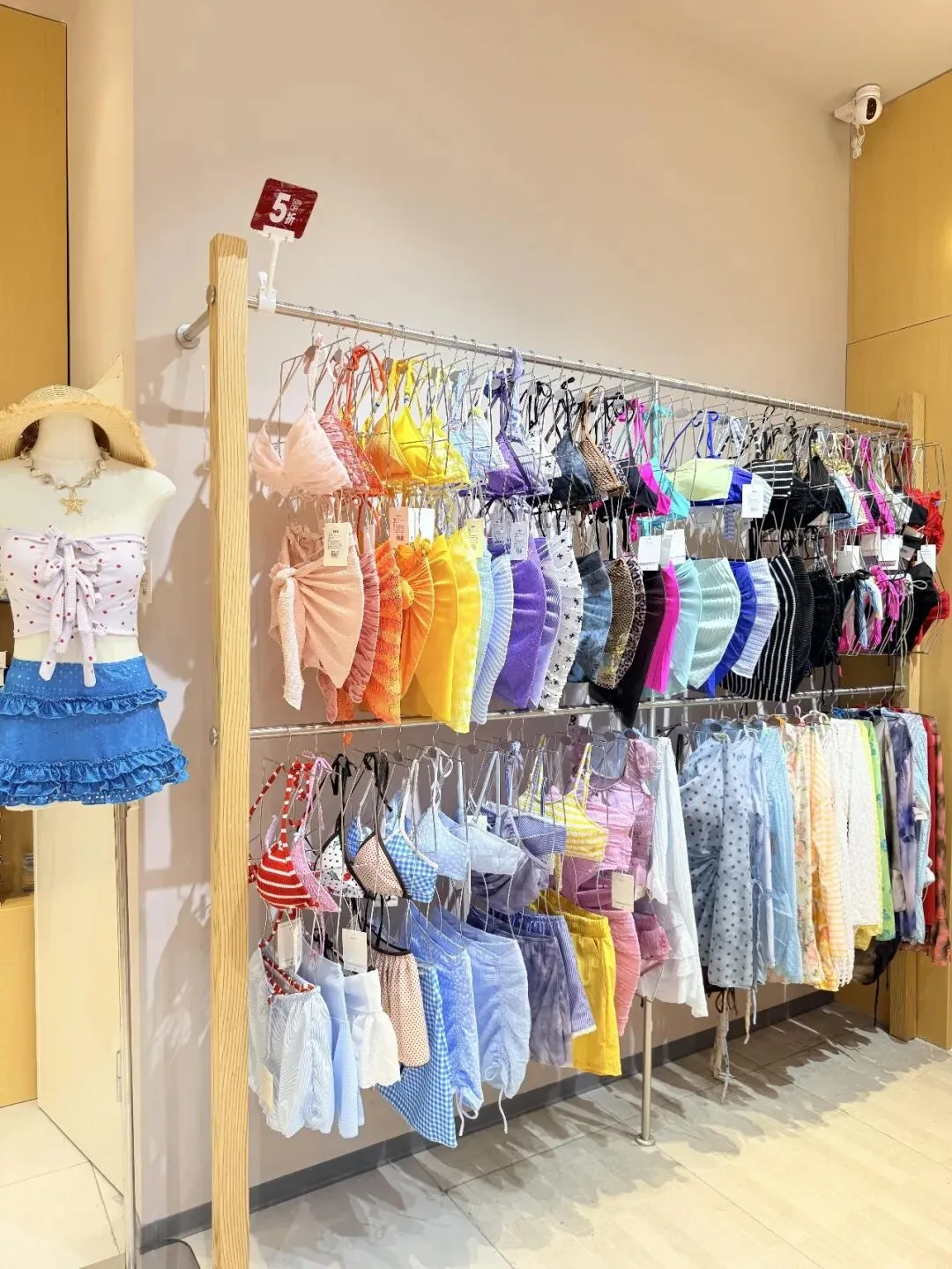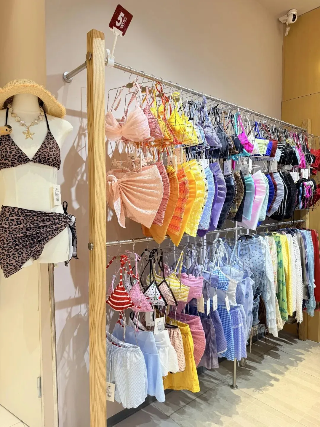 走到一整面泳衣墙前,镜头轻轻斜过去拍,让挂杆从近处顺着延展到远处,左边可以稍微带一点模特或边框,不用完全拍正,画面会更有方向感,