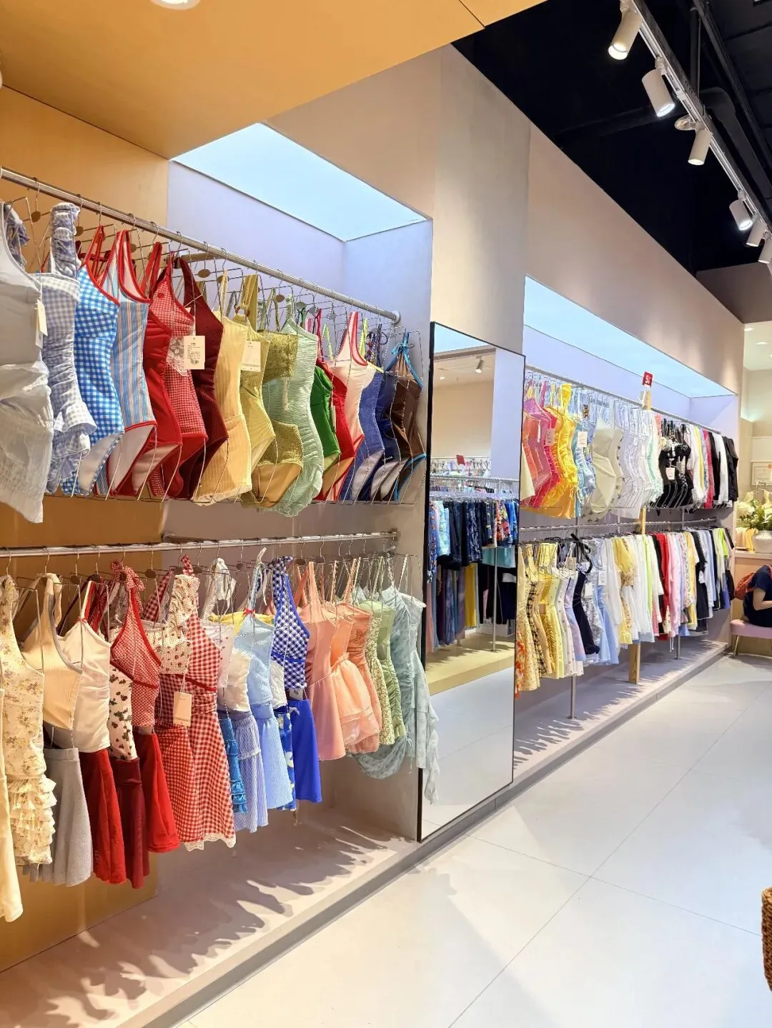 拍到有镜子的区域时,别急着只拍正面货架,可以把镜面反射一起放进来,镜头稍微往右带,让前景的泳衣,镜中的陈列和后排衣架同时出现,空间感一下就拉开了,