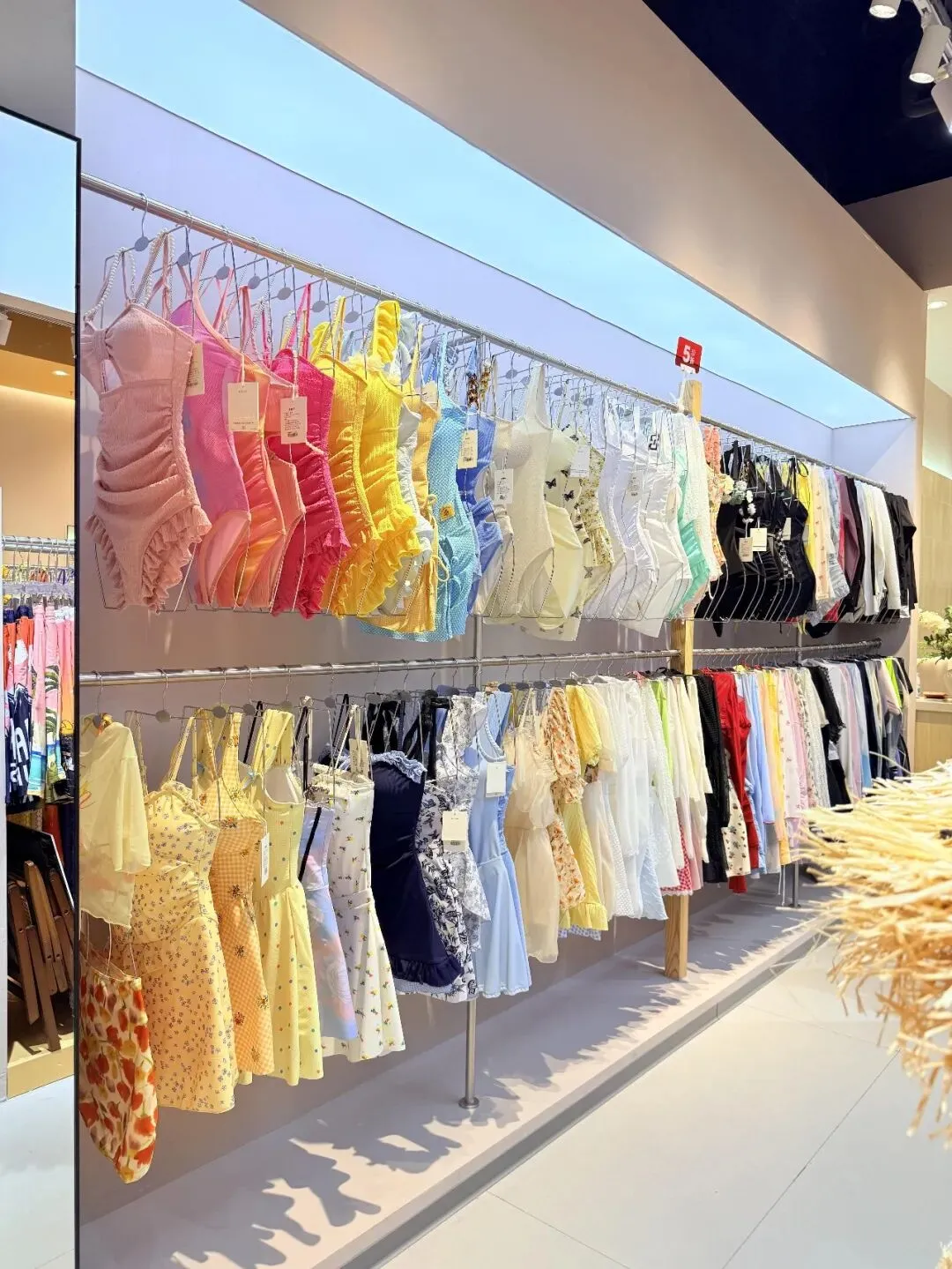 走到浅粉,奶白,淡黄比较集中的区域,镜头可以平一点,轻轻往侧前方拍,让上排连体泳衣和下排裙装同时出现,前后都留一点空间,画面自然就会显得轻,