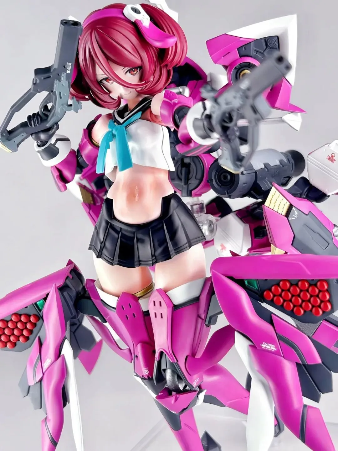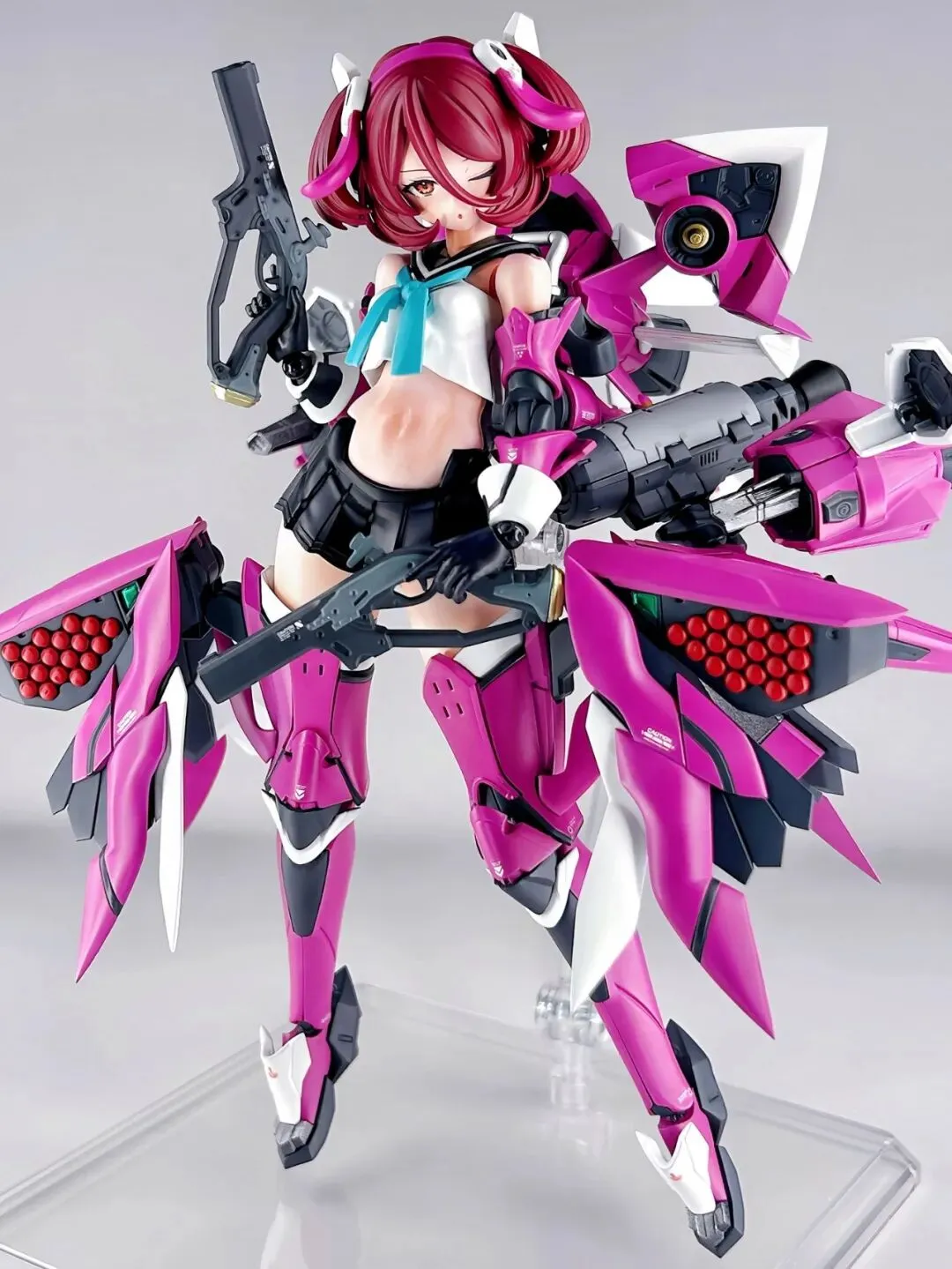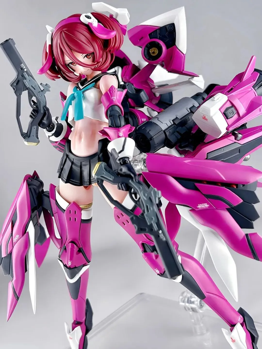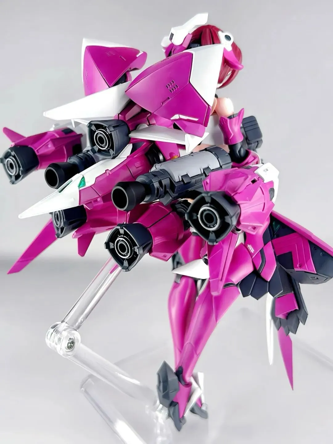 而它的“灵魂”,则来自《高达SEED》的线控炮筒系统。熟悉SEED的胶佬都知道,线控炮筒(Wired Gunbarrel)是地球联合军的黑科技,从莫比乌斯·零式的4组炮筒,到埃格萨斯的火力升级,这套系统一直是“王牌驾驶员专属”,能通过钢缆操控炮筒,从敌机盲区发起毁灭性打击。にくまん将这套系统小型化,移植到机娘背上,还给它搭配了《机战少女Alice》一条绫香的专属导弹吊舱,让这台粉毛机娘,拥有了媲美联邦MA的火力。