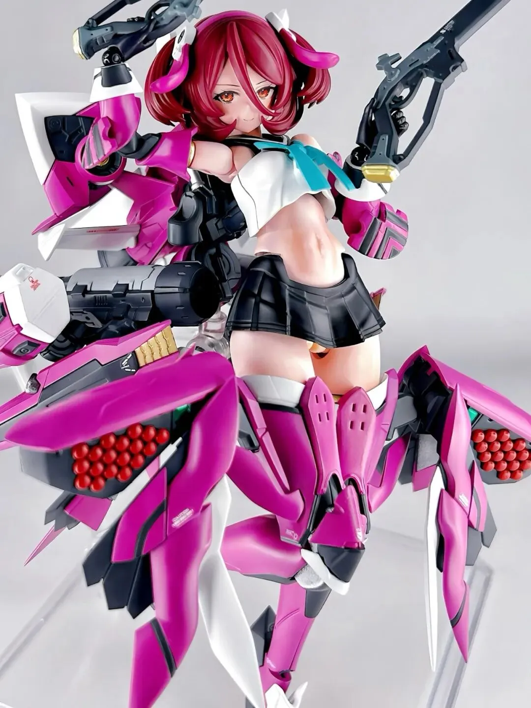 Vamilia的素体基底,来自《女神装置》的GUNNER(枪手)和TANK(坦克)两种素体,这两款素体都搭载了浅井真纪设计的“4th Machineca”可动骨架,可动性拉满,能轻松驾驭各种重型武装,这也是它能挂载海量武器的基础。にくまん没有简单拼接,而是用朱羅1.5型的大腿和环状零件,微调了身材比例,让它既有TANK素体的敦实下肢(能扛住重武装重量),又有GUNNER素体的修长身段,穿重甲也能保持“纤腰大长腿”的凌厉剪影,完美平衡了“少女感”与“机械感”。