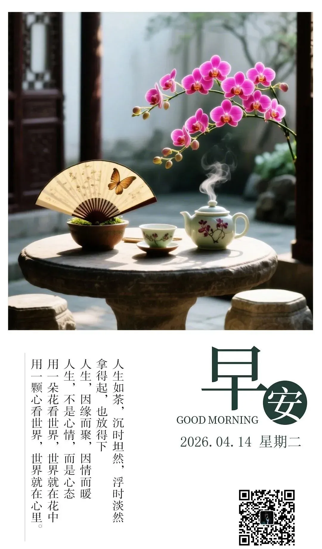 当前位置:首页>美女资讯>4月14日早安心语祝福图片:人生如茶,沉时坦然,浮时淡然;拿得起,也放得下.