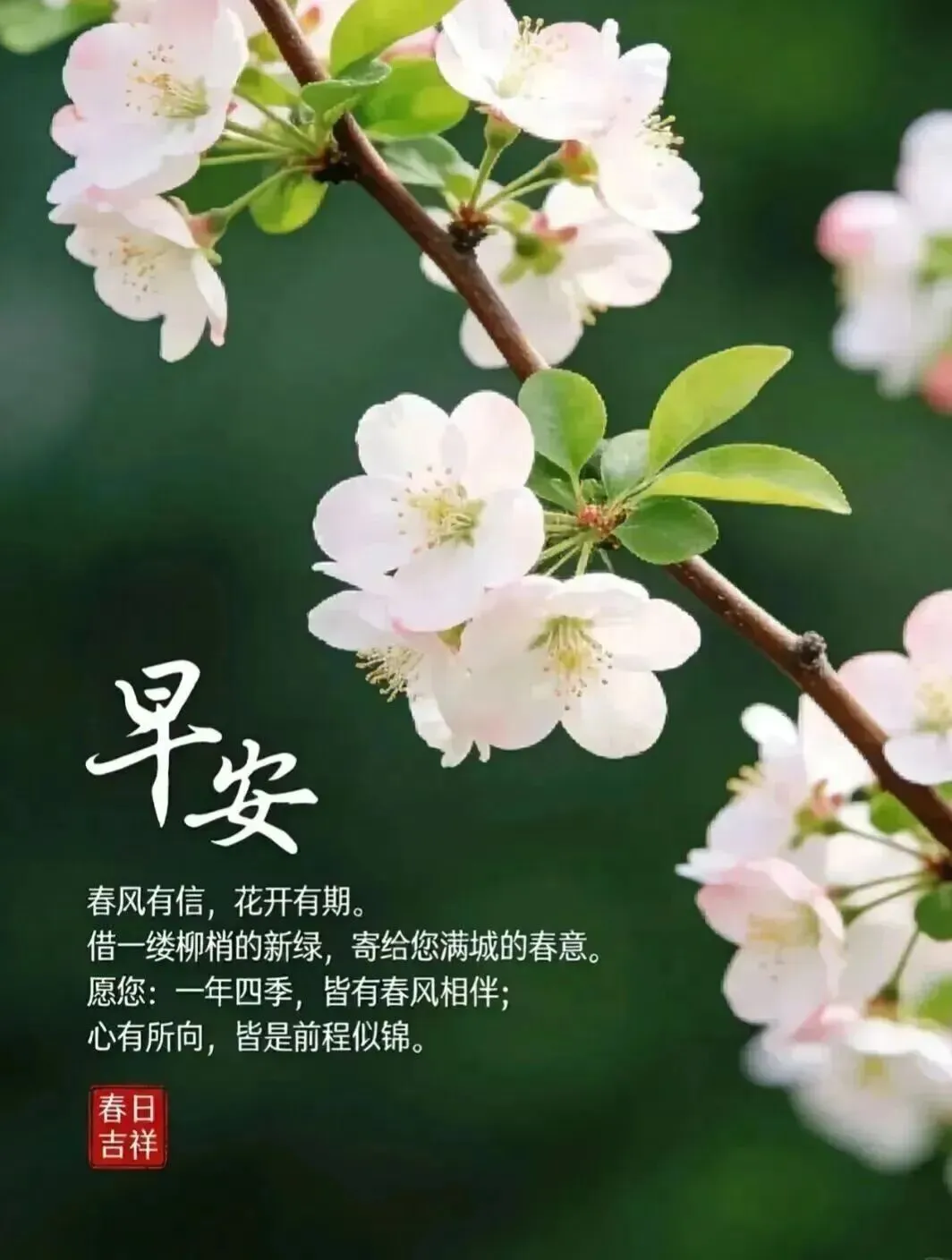 29、春风不语,却滋养万物;问候不多,却装满真心。用快乐的心问候珍惜的人,用真诚的情祝福最牵挂的人。愿我在乎的你清晨醒来精神好,心情好,运气好,身体一切安好!早安吉祥