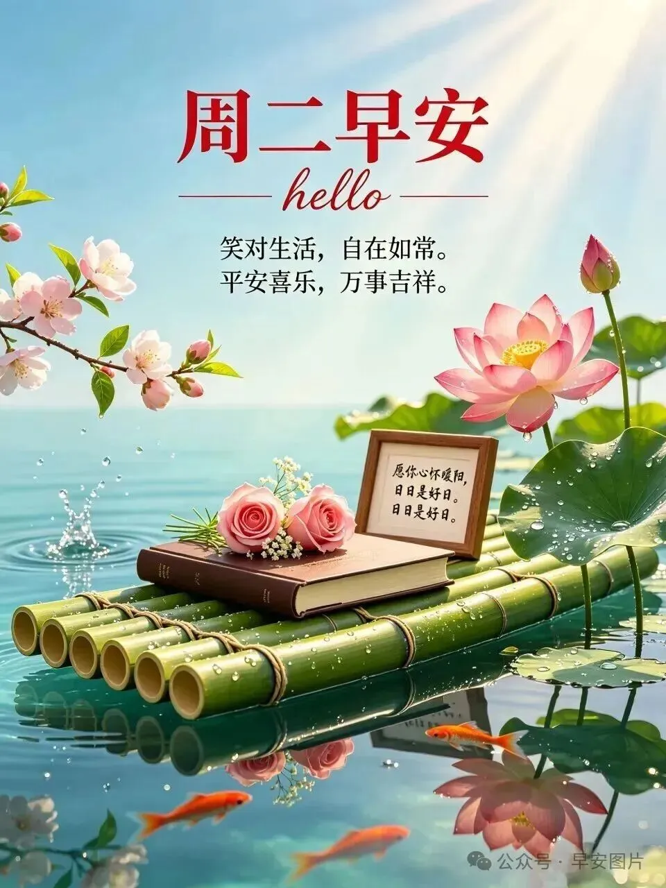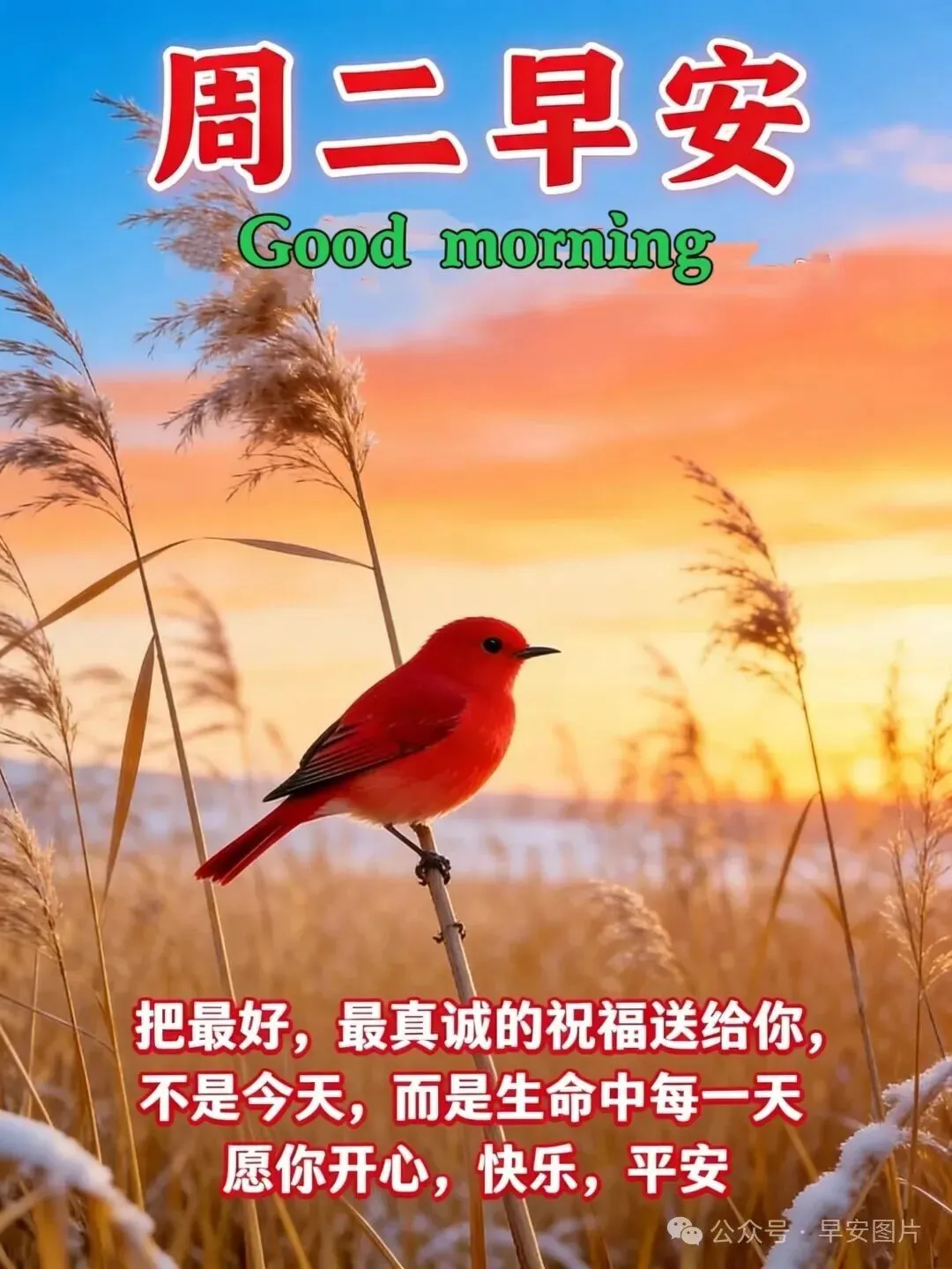 💐周二的晨光格外温柔🌞,问候虽简情意深重🌟,珍惜身边相伴的缘分🤝,珍藏彼此真挚的情谊❤️,愿岁月善待你我,三餐四季安稳舒心🍚,平安喜乐,万事皆能如愿以偿🌸