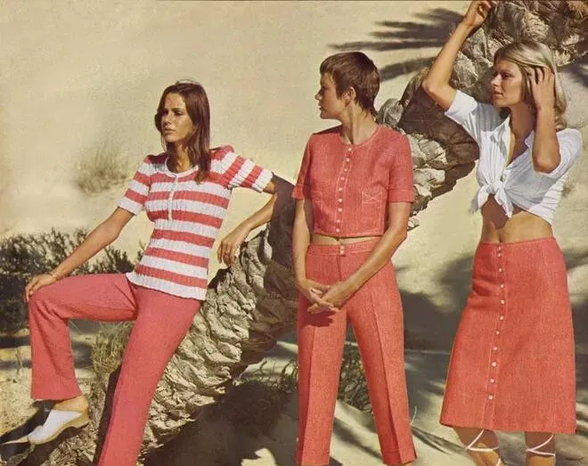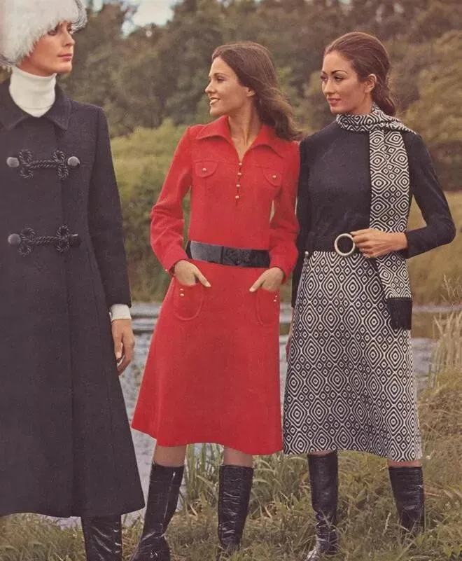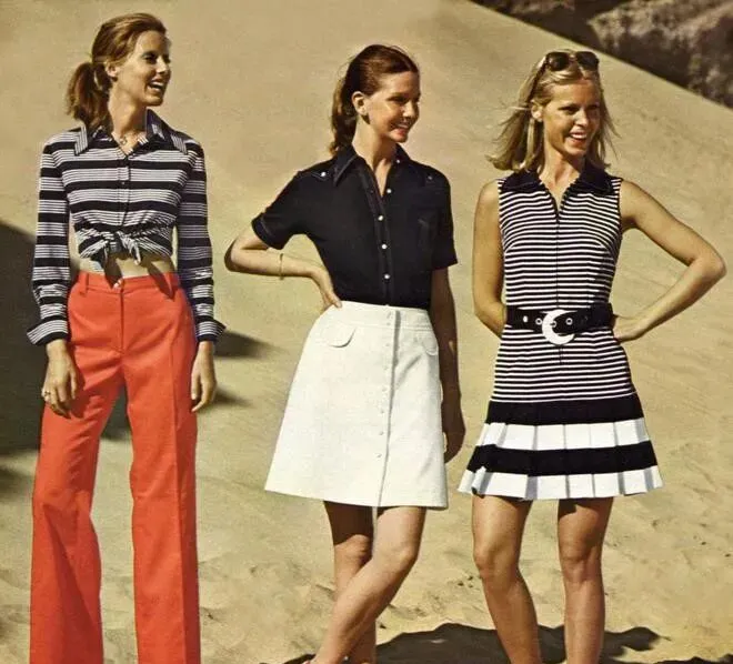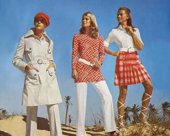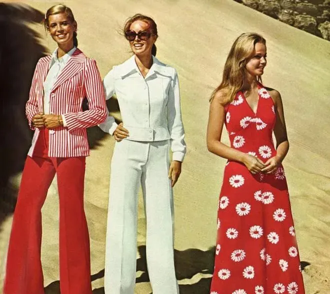 图上一字排开,左边这套白色风衣加阔腿裤,分量不轻,面料是有点挺的旧棉布,扣子、大皮带,正经派头,大檐帽一戴上,脸立刻小了一圈,这种剪裁根本不拖沓,腰线收得明白,有点现在“摩登都市女强人”的劲头,脚下往常顶多来个短靴,人家直接配平底鞋,风一吹,衣角顺势飘出来,那感觉十足精神,正中间的大红几何长上衣,搭配白色直筒裤,颜色撞得利落,七十年代的**“撞色”**风潮可不是浪得虚名,右边格子短裙加绑带凉鞋,白衬衫塞进裙腰,整个一个阳光沙滩感,站姿也敞亮,跟家里那年代“灰蓝棉布裤”完全两回事。