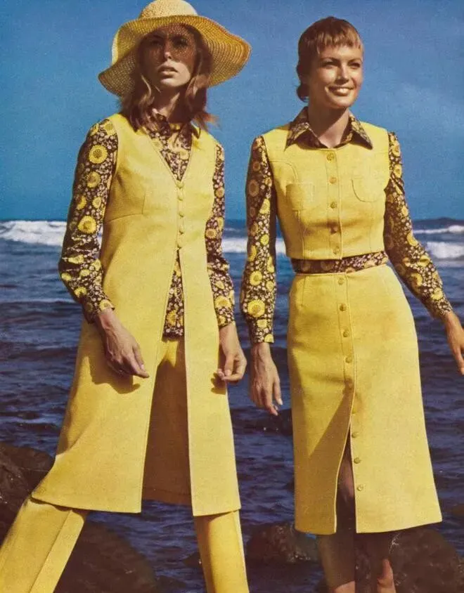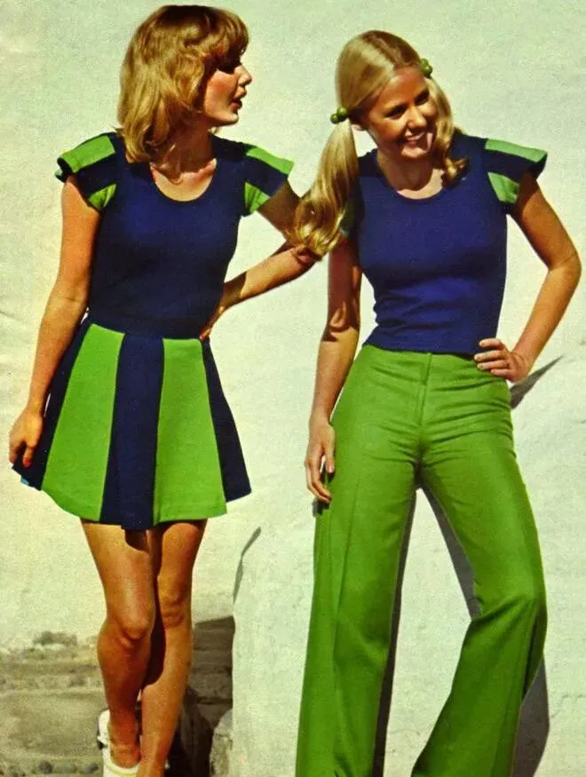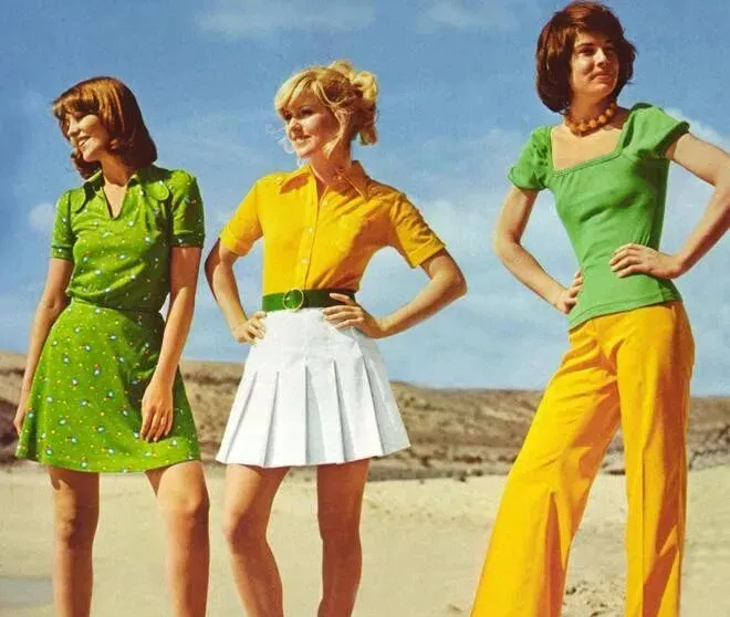 黄色衬衫短袖配白色百褶裙,这配色搁70年代的国内绝对扎眼,腰间一圈大粗皮带,绿得很正,旁边绿短袖小花连衣裙,扣子一排,麻利得很,右边一身亮黄色喇叭裤,橙黄配绿色领口,布料带点光泽感,那股活泼劲走哪儿都不怯场,妈妈看到这里就说了一句:“你看人家那条裤子,光颜色就比我们那会提气”,小时候家里只有深色旧裙子,从没这果断的撞色,“现在年轻人喜欢的鲜亮,原来早就在西方流行过”。