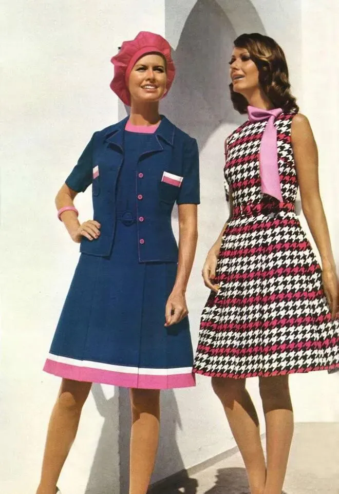 左边海军蓝短袖西装加粉边,裙子下摆还有条白粉线,衣角、帽子颜色一点不少,细节摆得明明白白,旁边千鸟格连衣裙一看工整利索,这种斜格子配色放现在还挺高级,脖子上绕条同色小丝巾,戴不戴其实都讲气氛,那会儿穿衣敢玩花样,没什么拘束,笑起来就特别自信,一张嘴不是那种婉约,是咧嘴那种爽朗