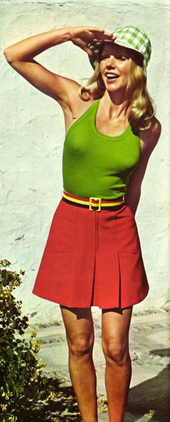 绿色无袖配红短裙,这就是青春本色,腰带黄配绿,细节都满分,头戴格子渔夫帽,挡住点阳光,笑起来半天不合嘴,家里当年可没有这种短裙,会穿这种打扮的姑娘,定是最不怕晒黑那种,强烈得很,闹腾劲头正正好。