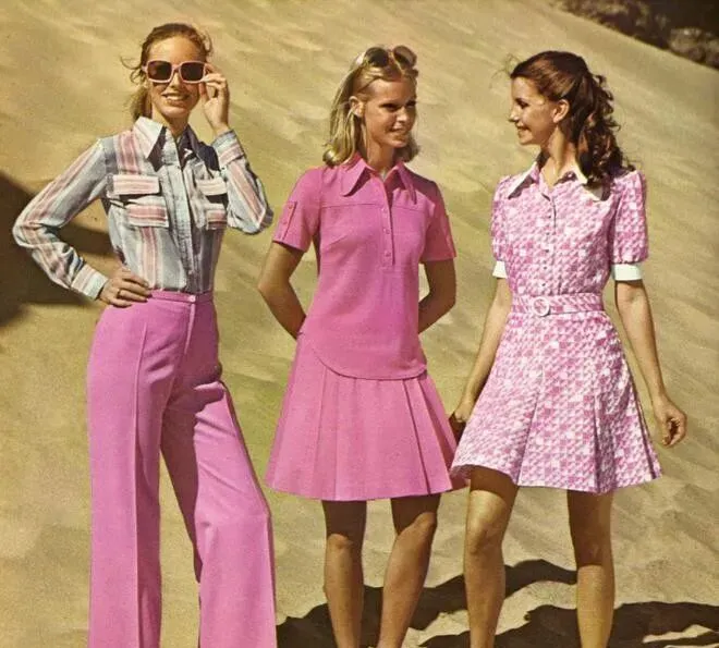 粉色衬衫配长裤,旁边A字短裙两种样式,一件是带口袋的运动款,另一件像现在制服裙,布料摸着手感发硬,衣服上一圈一圈都是工整的,钉扣扣得明细,配太阳镜真提气,姐妹们围着说笑话,夏天最适合这种透亮的颜色。
