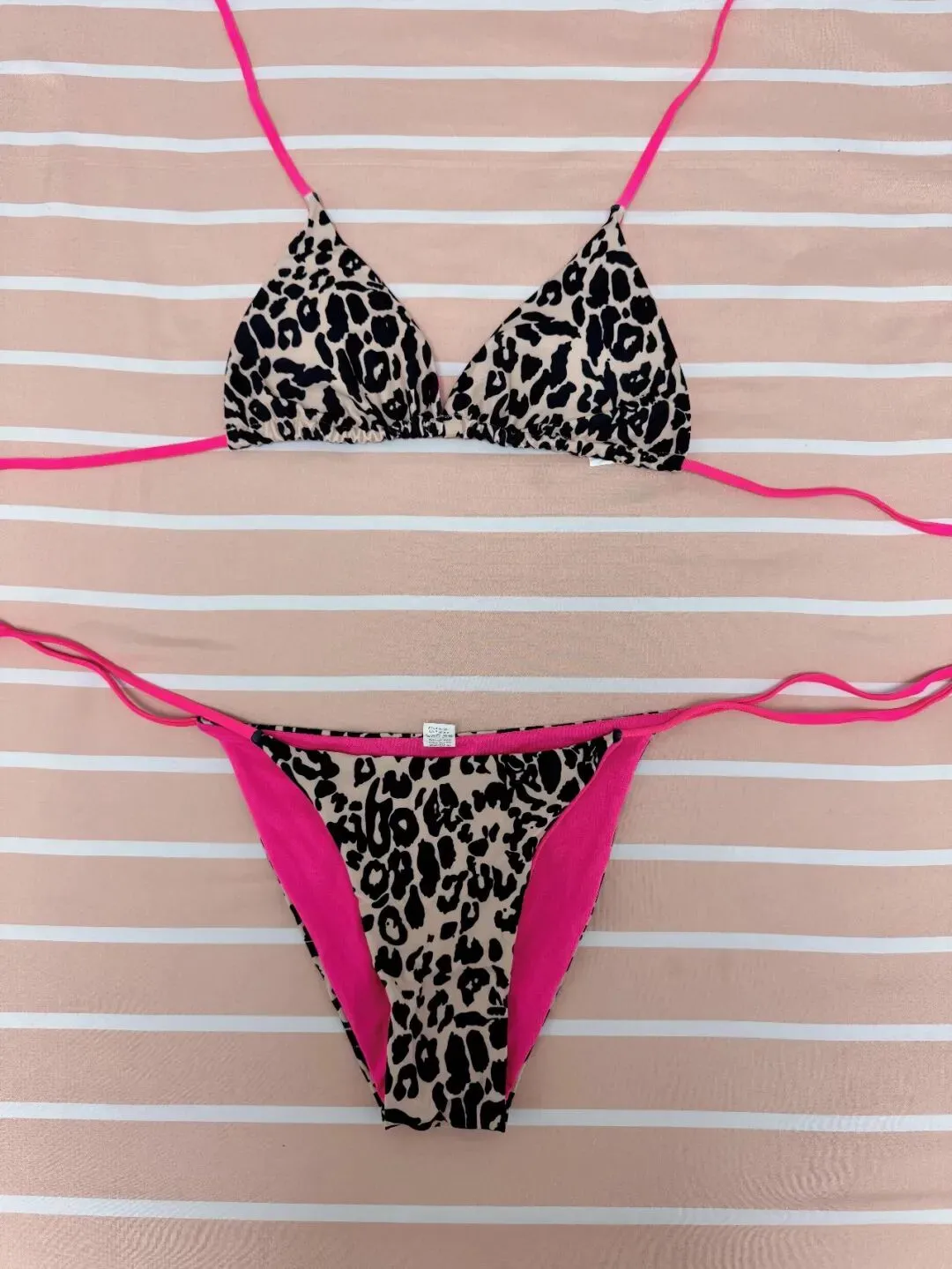 这一套是三角杯上衣配高开衩下装,底色是浅豹纹,侧边和肩带用了很亮的玫粉色去带出重点,颜色对比很直接,视觉中心会先落在上半身,再顺着亮色边线往下看,画面很有存在感,