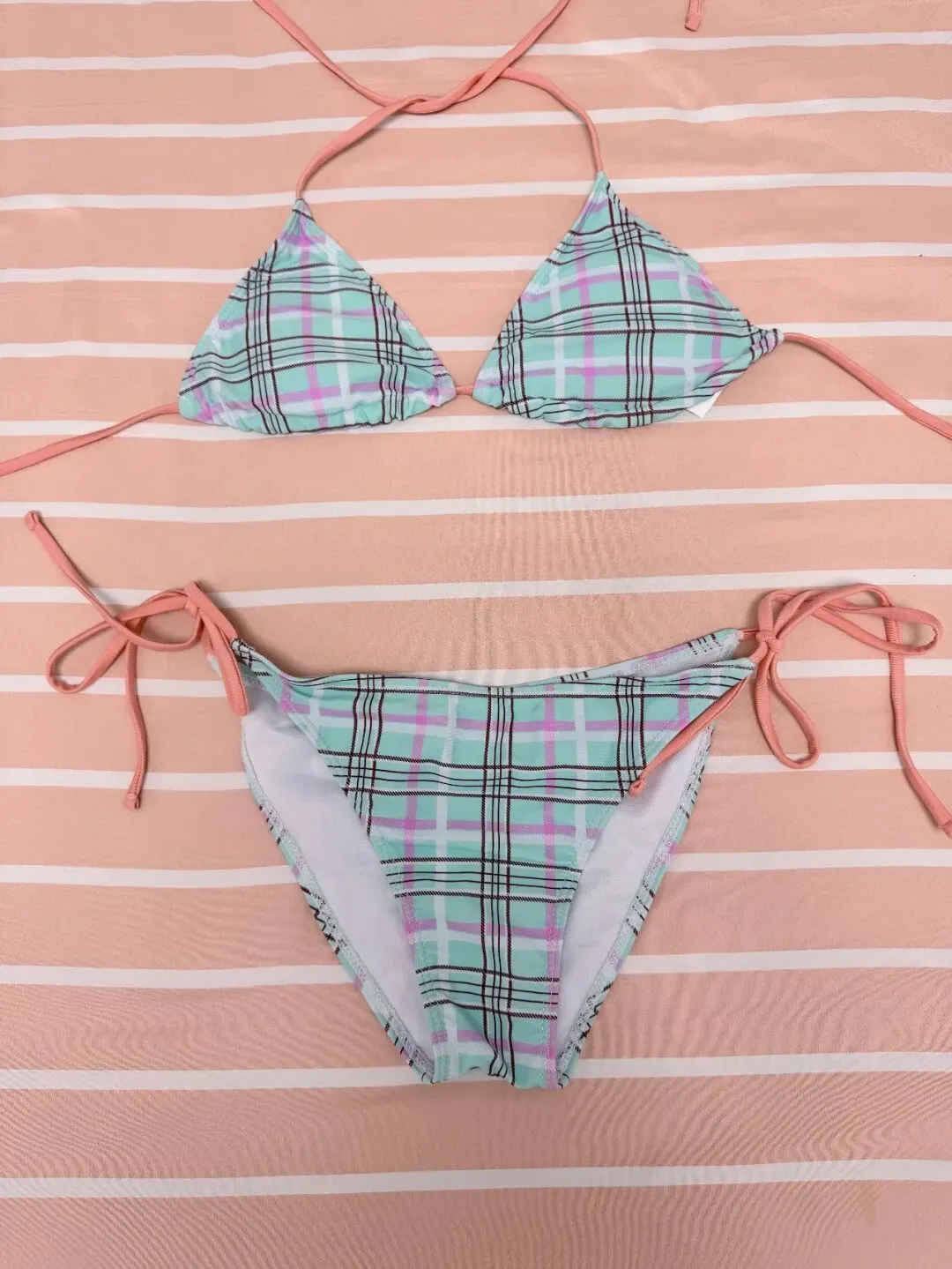 这一套是薄荷绿格纹配裸粉系绑带,上衣依旧是三角杯,但整体气质比前一套更轻,下装两侧是系带设计,平铺看就已经有一点点松弛感,到了人物上身时,也会自然带出更柔和的腰线和胯部线条,