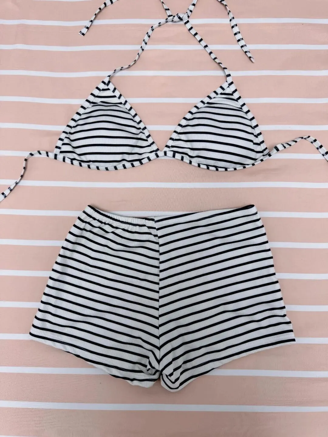 这一套是黑白细条纹上衣加同花纹短裤,比前两套更偏日常,也更有度假休闲感,上衣还是轻巧的三角杯,但因为下装换成了短裤,整套会显得更自在,走路,坐下,在海边散步时都更方便,动作空间也更大,
