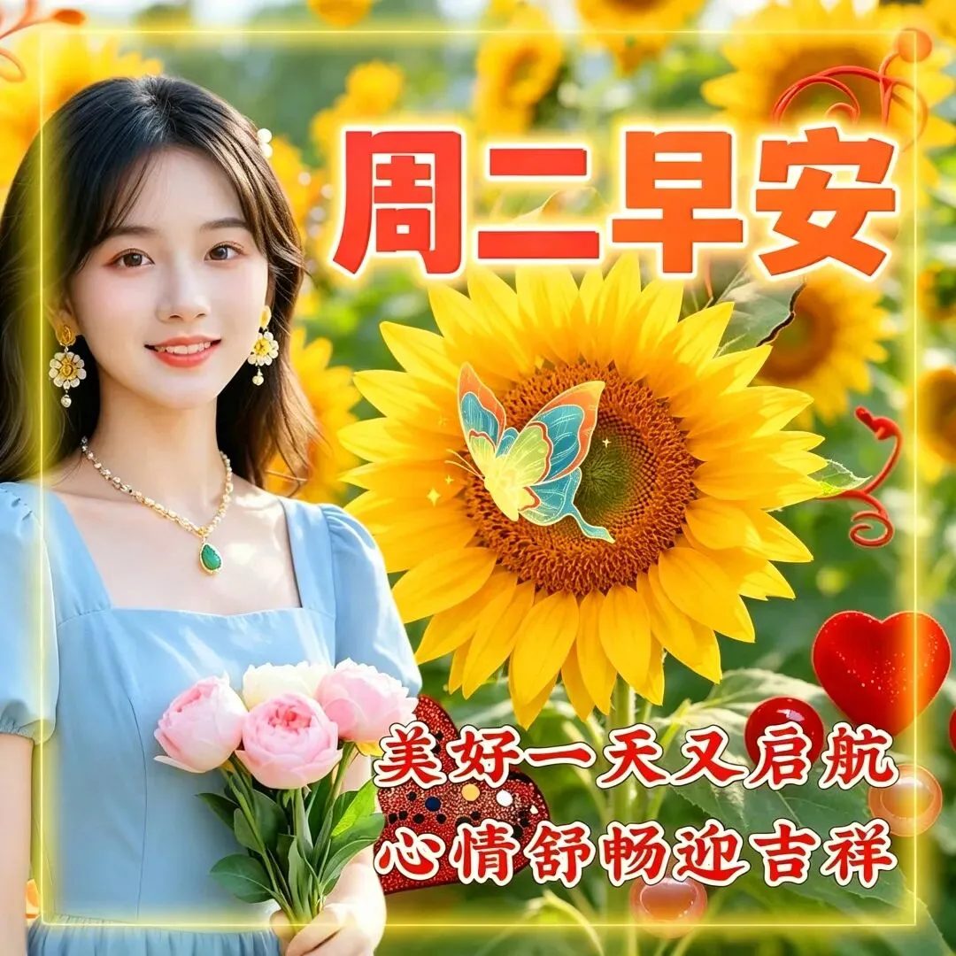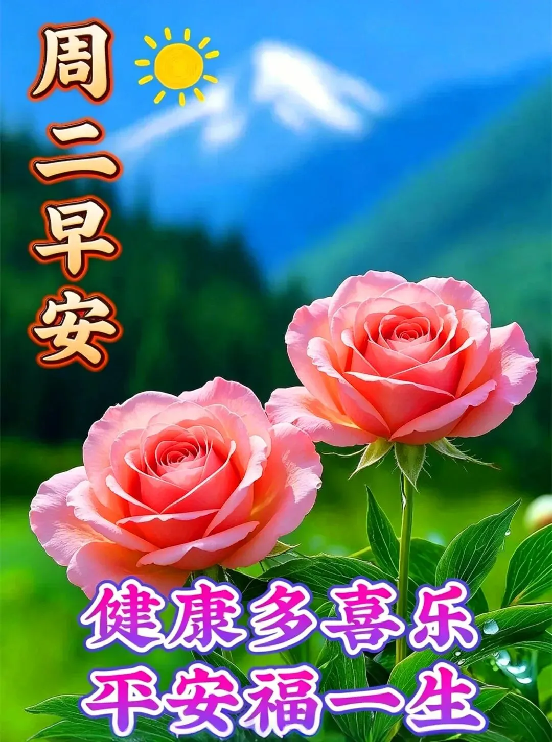 送上暖暖问候,愿快乐,朝朝夕夕;愿好运,日月相依;愿健康,不离不弃;愿平安,护你四季!周二早安愉快!