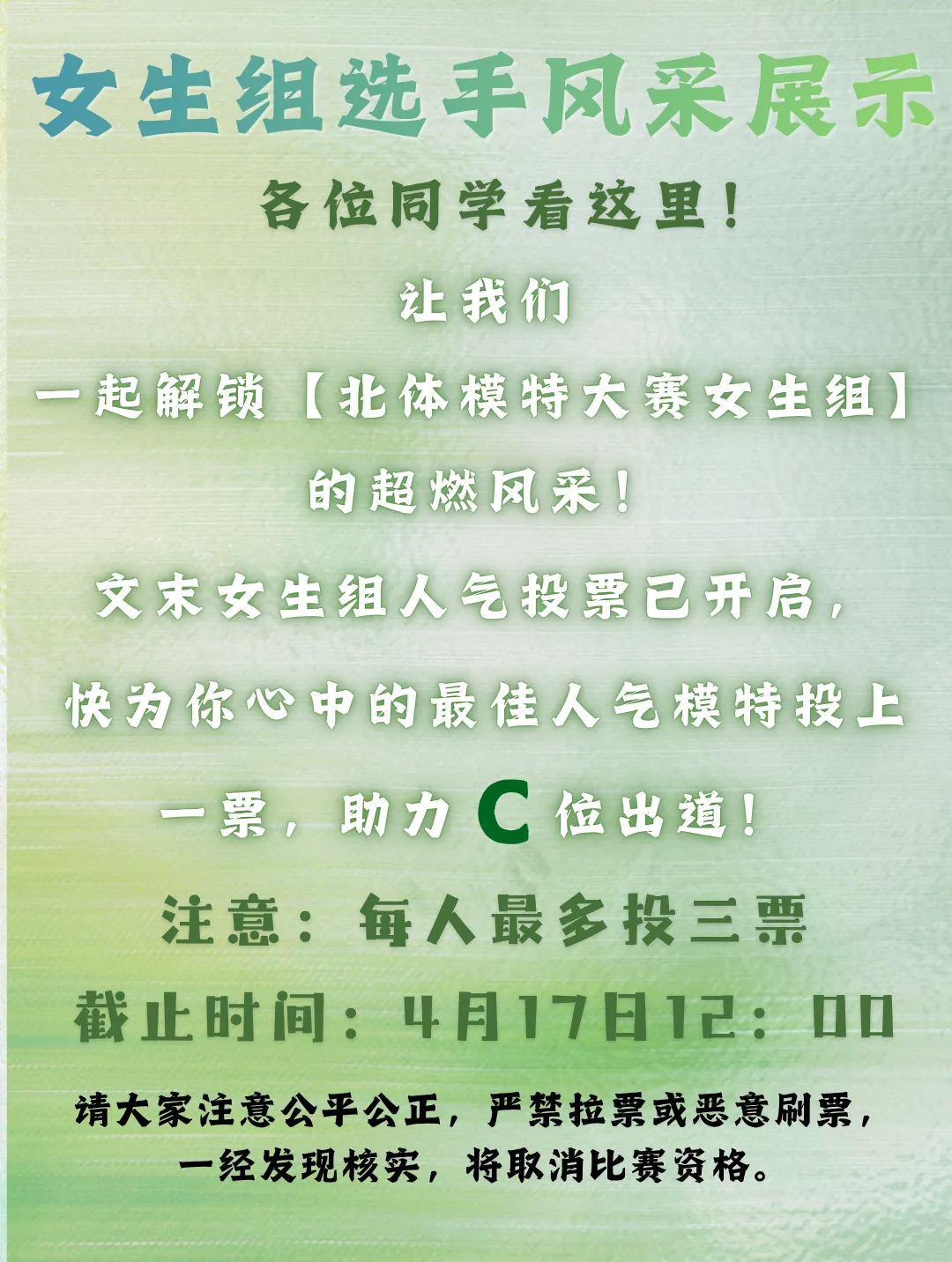 当前位置:首页>美女资讯>北体模特大赛 | 速来投票!女生组高光亮相!快来选出你心中的最佳人气奖!