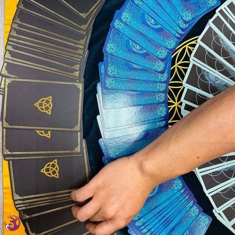 这个神谕组合竟然重复着凯尔特圣地格拉斯顿伯里的讯息,带有传说中盛着耶稣宝血的圣杯之井符号,且在两张神谕卡中都有出现圣杯。圣杯即是水元素,也是智慧与爱的象征,完全表达了辩财天女神的神性品质,为我们带来智慧与爱的祝福。