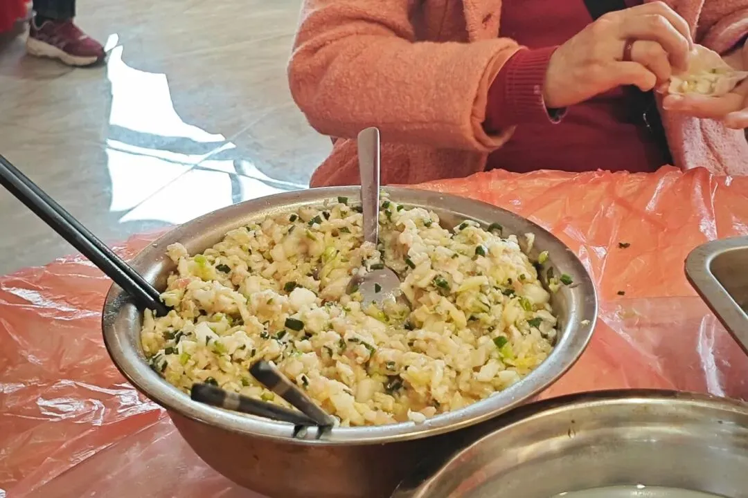 窗外春雨绵绵,屋内饺子热气腾腾。几位阿姨举起一盘刚包好的饺子,笑着让镜头拍——元宝形的、月牙形的,每一只都包得饱满匀称,透着家常的妥帖。