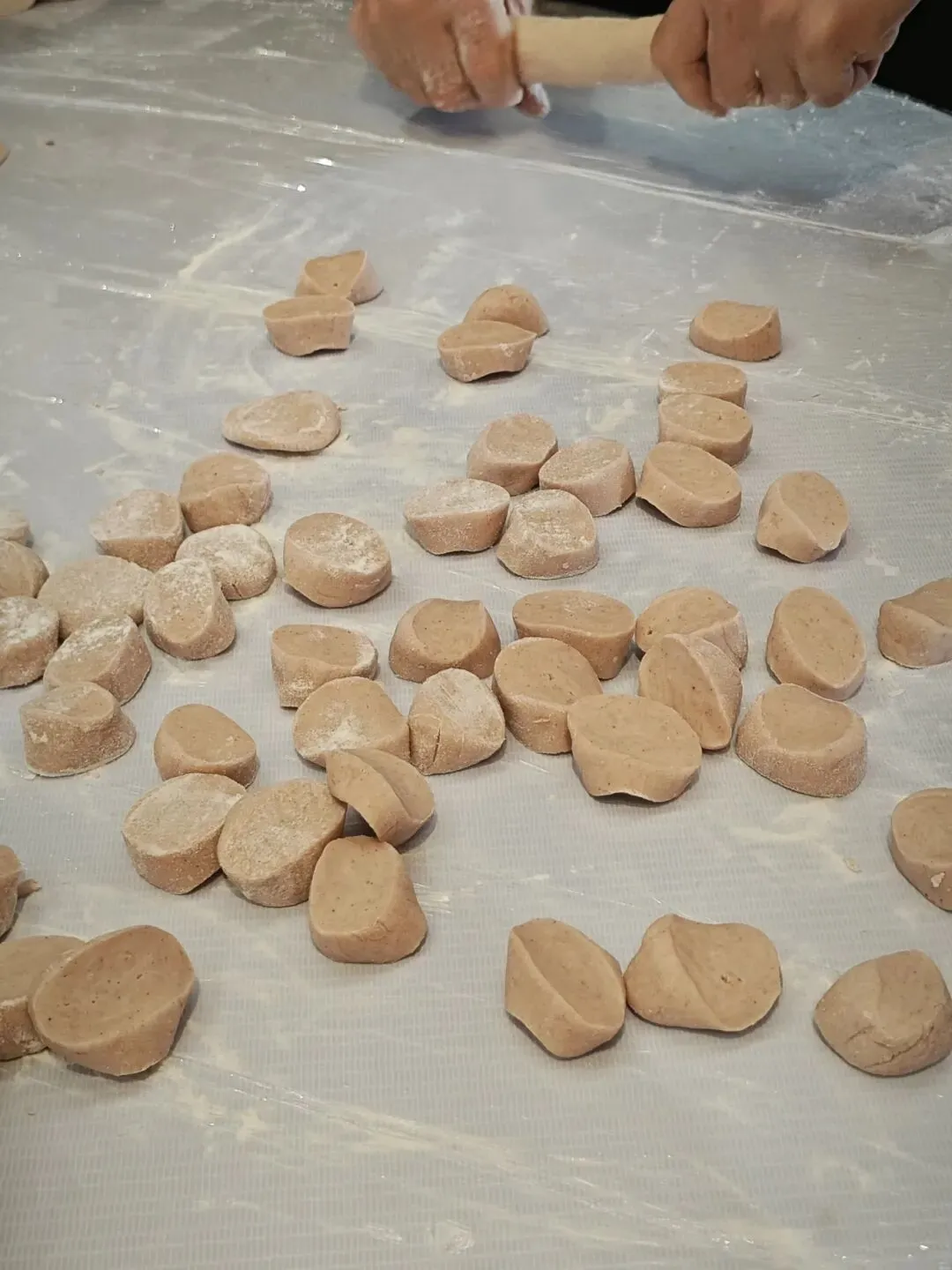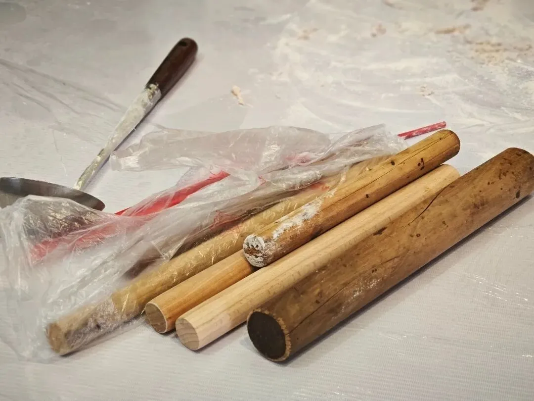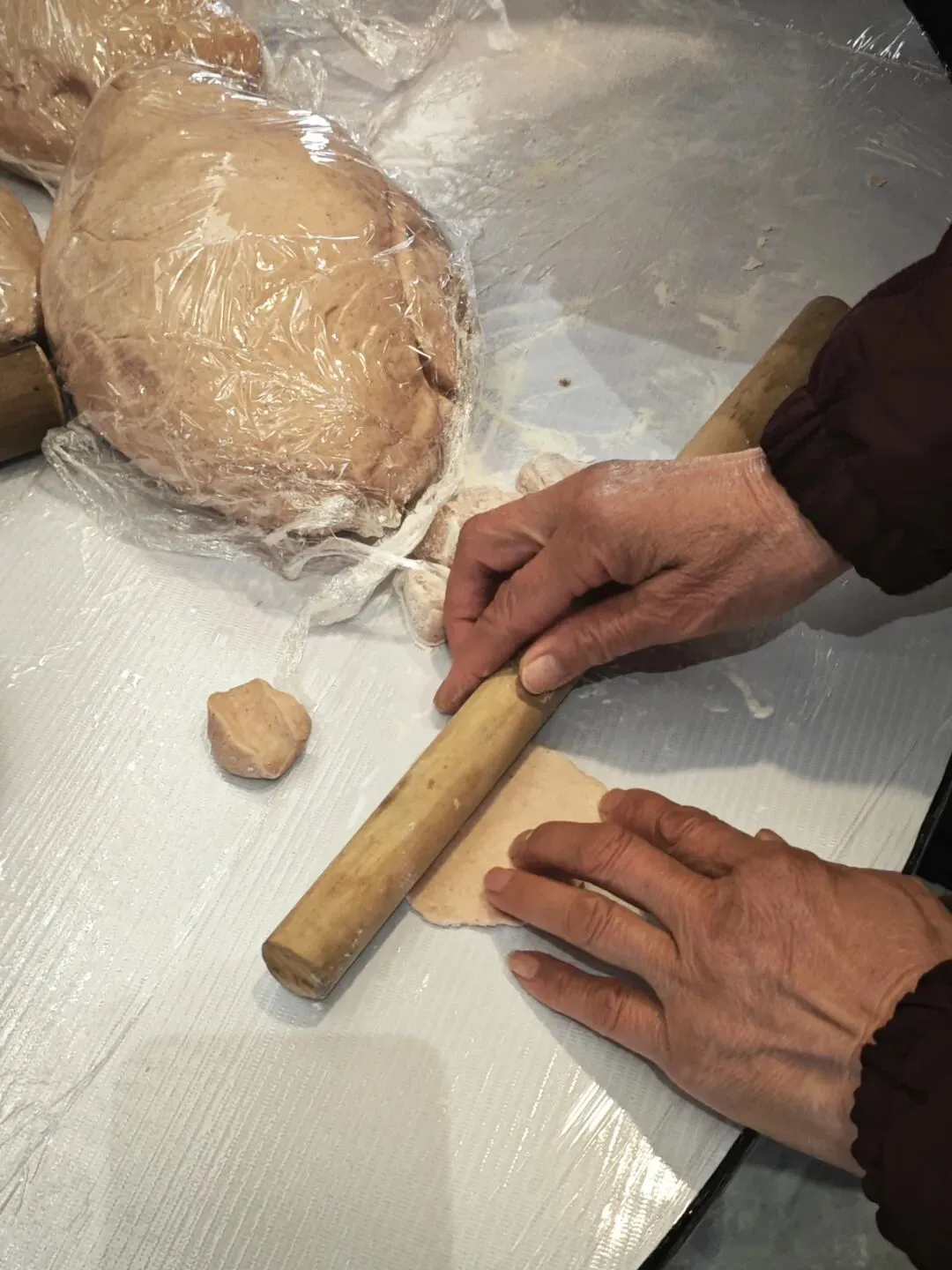 几位男士也没闲着,撸起袖子守在案板前,负责擀皮。面团在他们手里转几圈,一张张圆圆的饺子皮就出来了。有人擀得快,有人擀得厚薄不均,但不管擀成什么样,递过去的时候都带着笑:“来,接着包!”