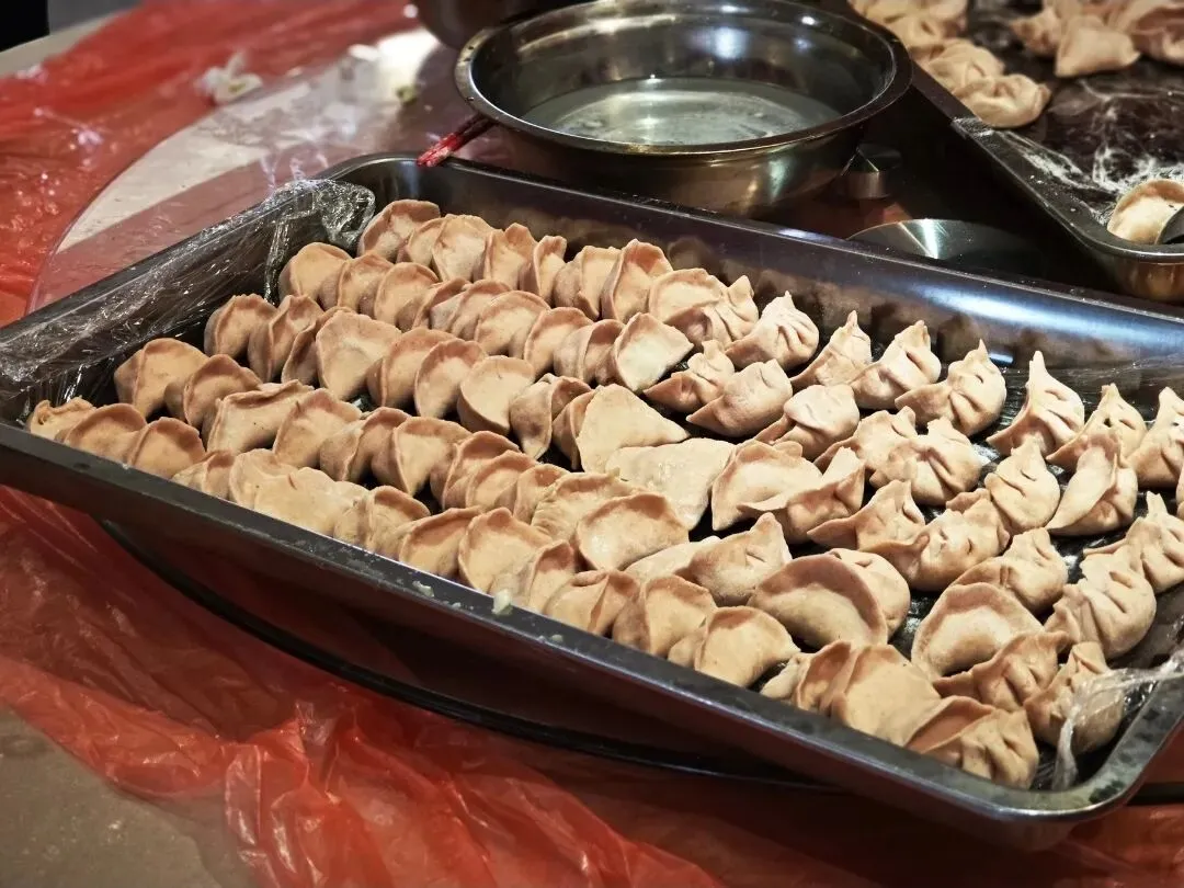 阿姨们是今天的主力。手指翻飞间,一个个元宝似的饺子整齐排列在托盘上。有人包得快,有人包得慢,但边包边聊,手里的活儿一点不耽误。