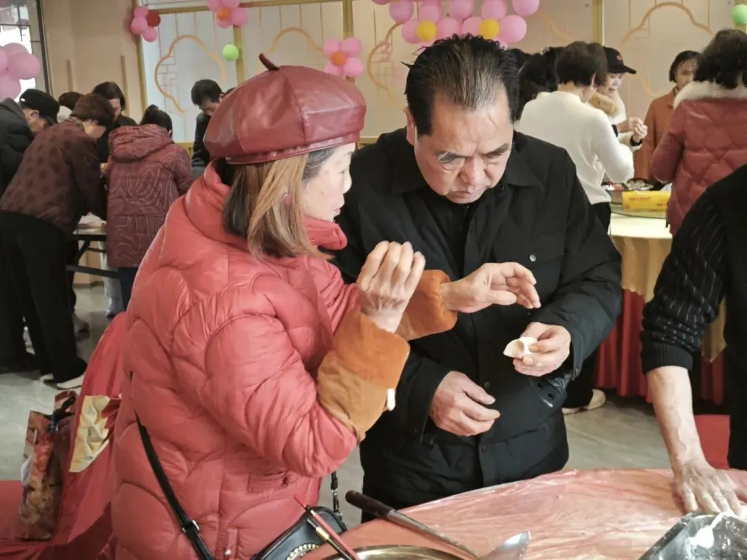 最有趣的是刘叔叔,平时在家可能没机会上手,今天也撸起袖子学着包。捏得紧了,皮粘不住;馅放多了,撑破了皮……旁边的蔡阿姨看不下去了,笑着凑过来:“哎呀老刘,你这包的是饺子还是包子?来,看我,少放点馅,边上捏紧点。”