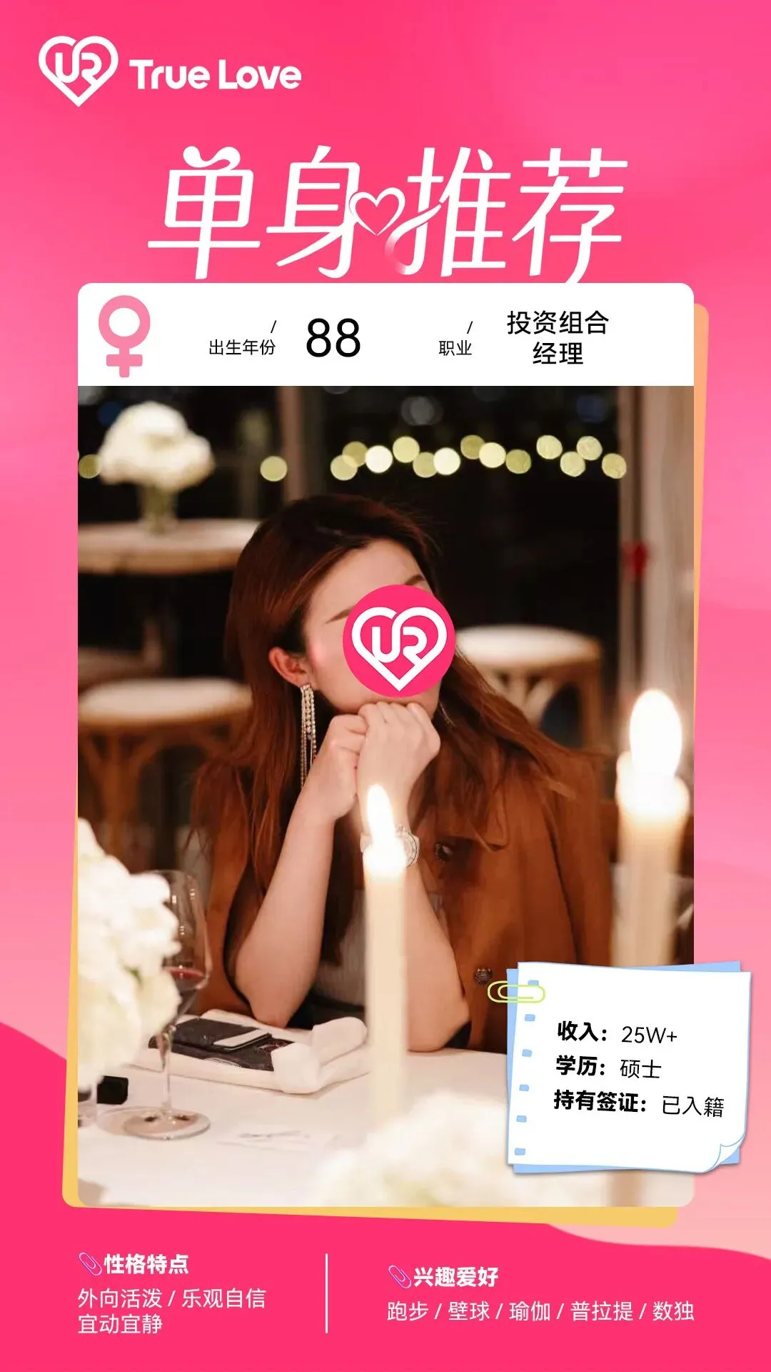 88年投资组合经理,名校硕士学历,已入籍,年入25W+。射手座,成长于开放包容的家庭氛围,性格外向活泼、乐观自信,对外独立果敢有逻辑,对亲近的人却温柔细腻~