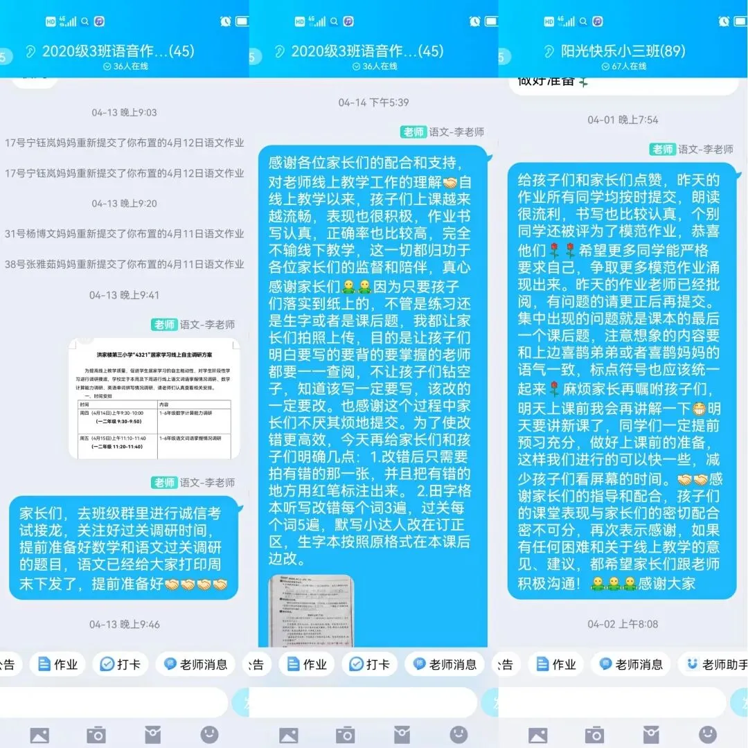 8点30分  回到办公室,第一节是数学课,我会打开腾讯会议,进入各位老师们的会议室,谷蓉蓉老师在协助数学老师对学生进行考勤并关注每一位学生们的学习状态,在三小“双师”课堂是我们的常态。每一个会议室里思维的碰撞、师生的互动都那么自然,会心一笑,退出各位老师们的会议室。进入各班级群看一看学生练习提交情况,看到老师们的一个个红对勾,一句句中肯的指导,那份感动再次涌来……