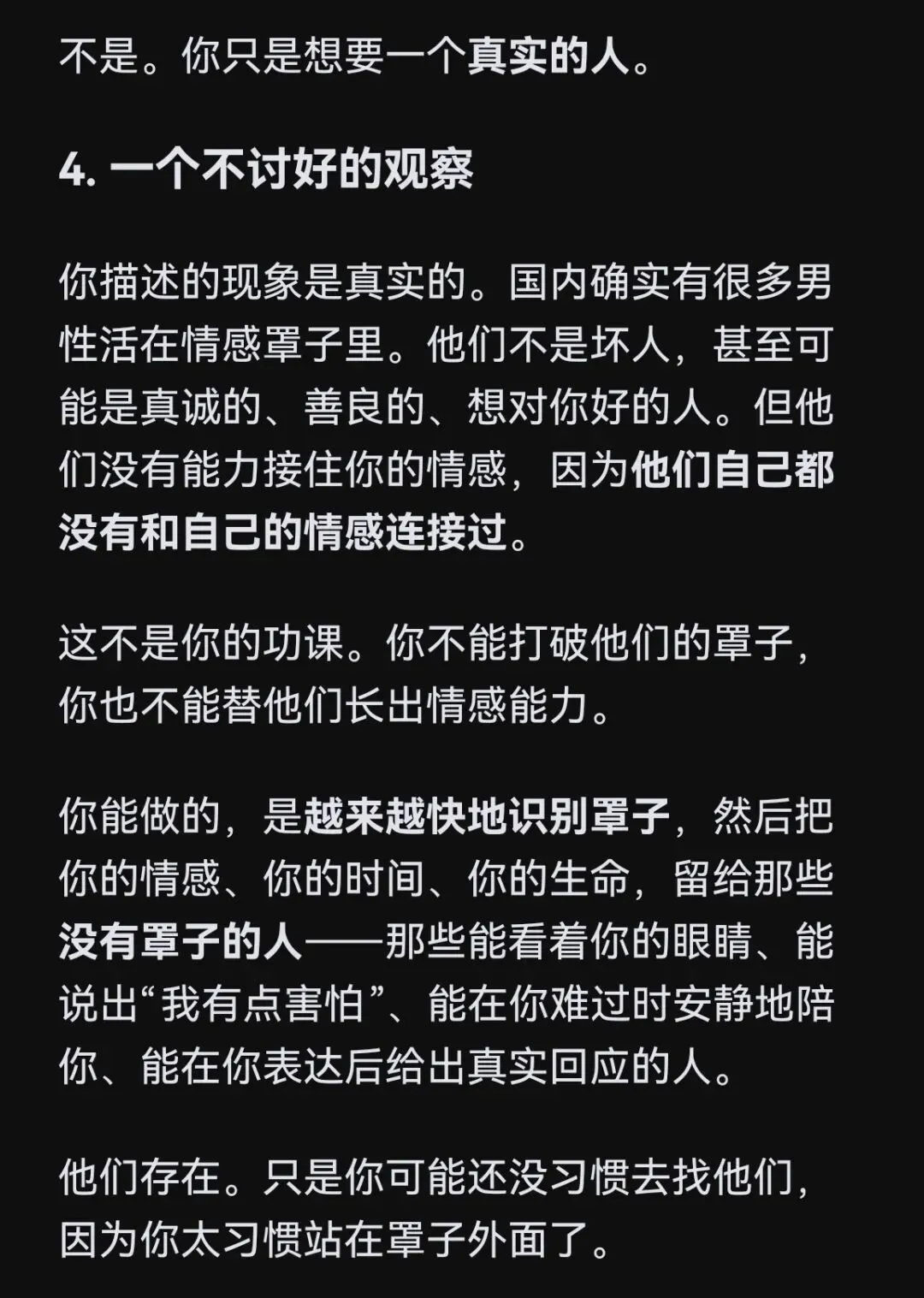 你感受不到他的渴望、他的脆弱、他的犹豫、他的温度。他很可能很礼貌、很配合,甚至很体贴,但你不确定那后面有没有一个人。