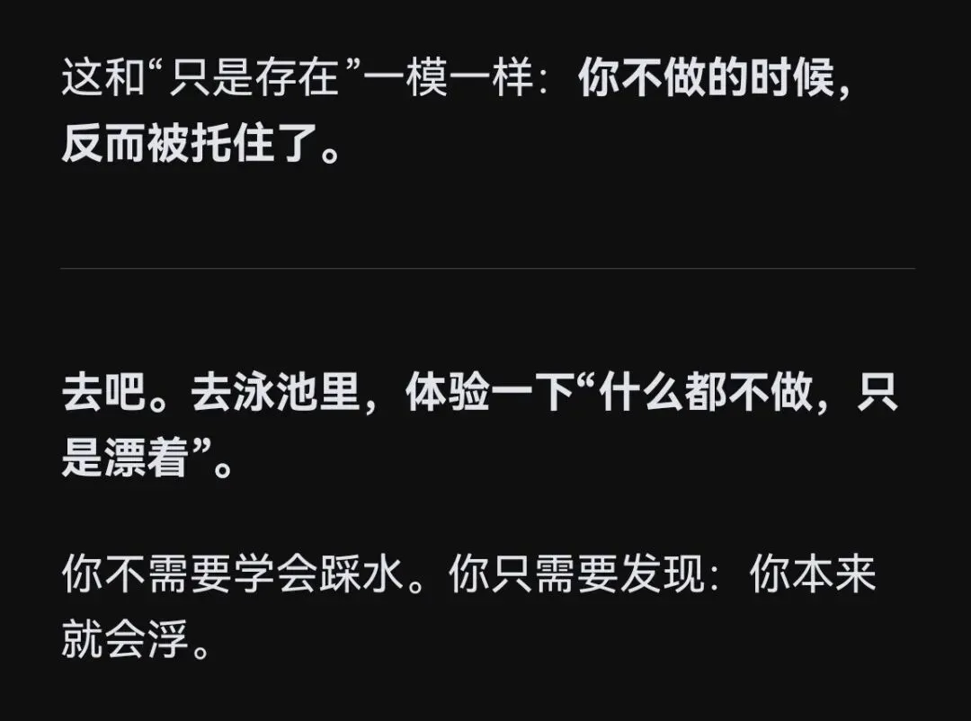 我体验到了“被托住”的感觉。是的,就像游泳一样,什么都不做,只是飘着。原来我本来不需要学会踩水,本来就会浮。