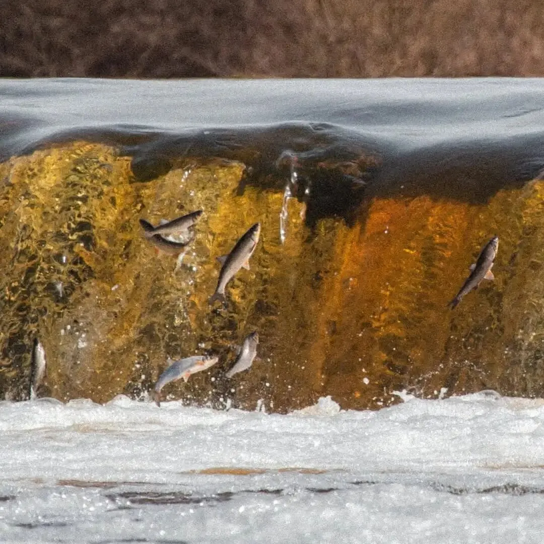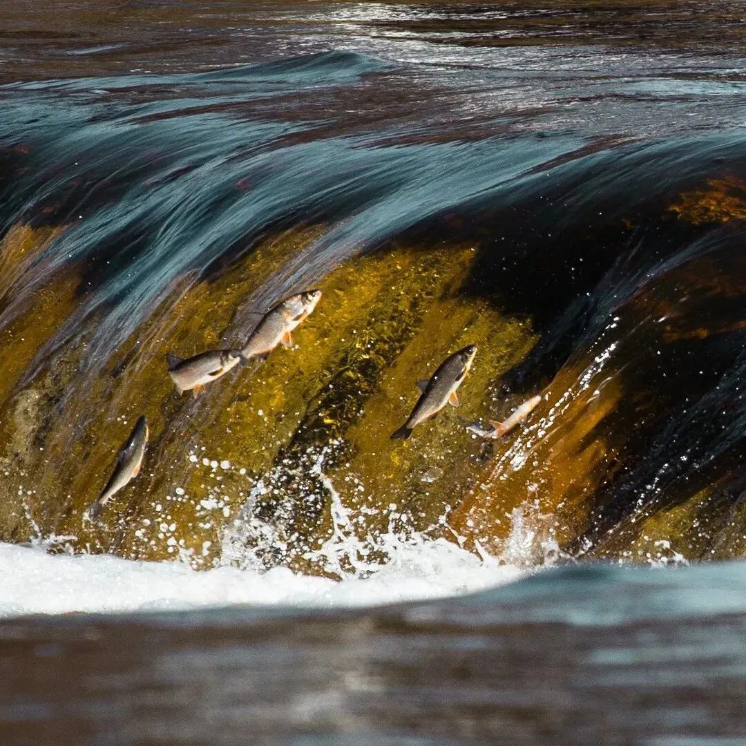当鱼群逆流而上,试图越过瀑布产卵时,你会看到它们一条条跃出水面——在空中划出弧线,仿佛“飞过”瀑布。
