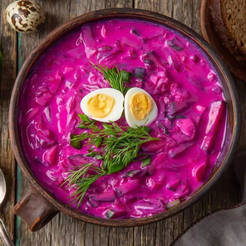 传统的做法是用甜菜根和酸奶制品,汤里还会加入煮熟的马铃薯、鸡蛋、香肠或其他肉制品、新鲜黄瓜、香料和时令香草等。味道如何,真的要你去亲自试试了。