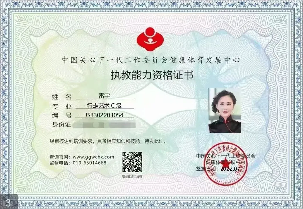 2022年取得中国关工委行走艺术C级执教能力资格证书