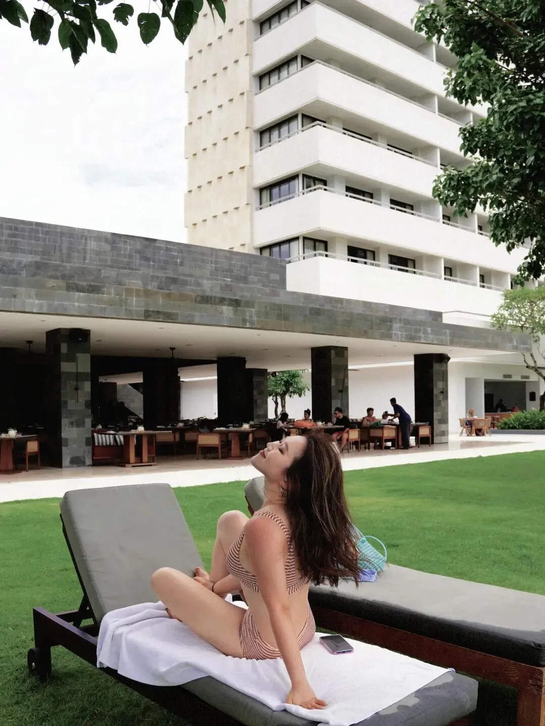 很多人去海边拍照,最怕的不是不会看镜头,而是动作一做就僵,手也不知道该放哪,整个人用力过头,这组图的厉害就在于,海边草地,躺椅和大树都很出片,条纹泳装本身也很有度假感,