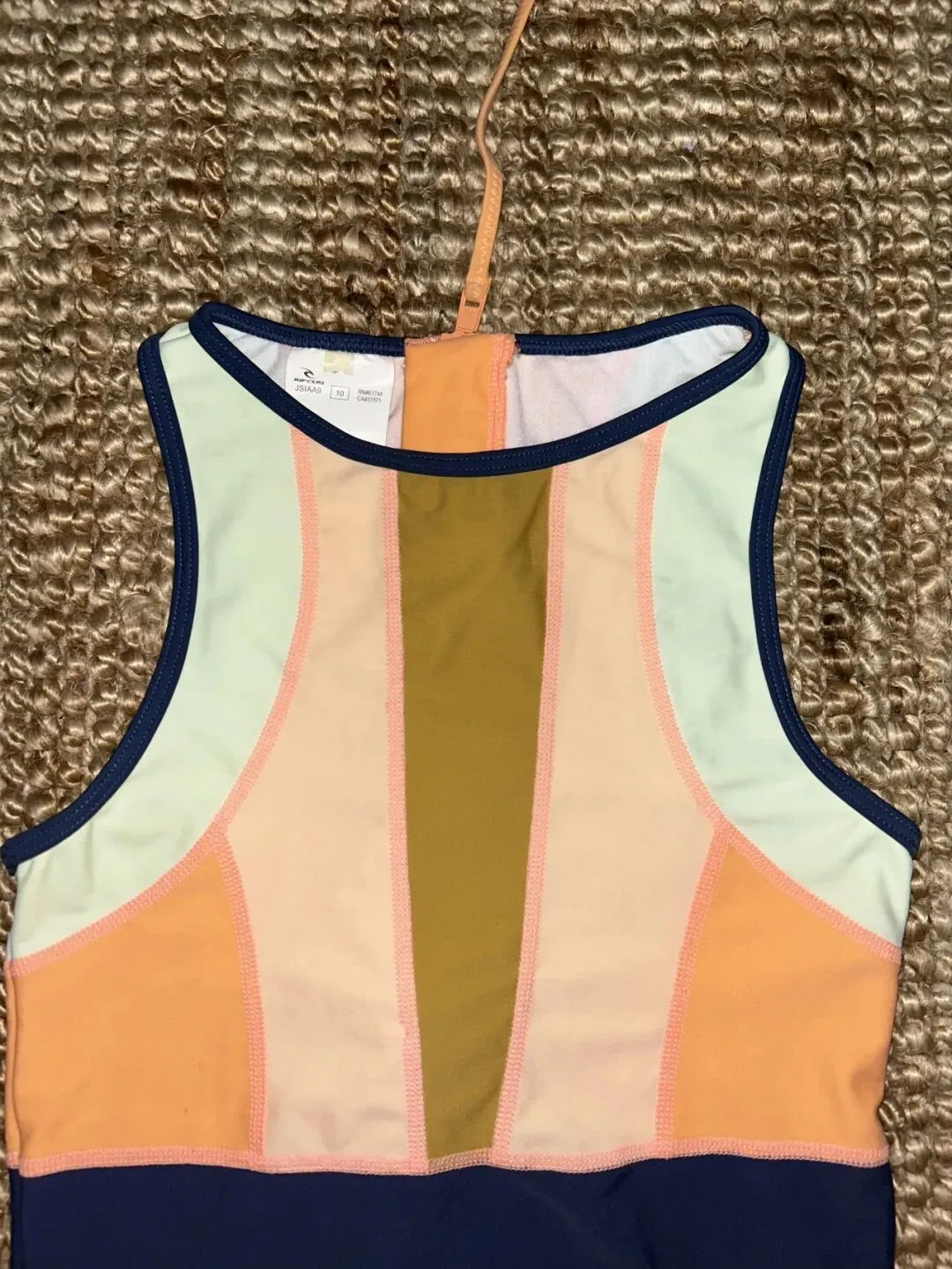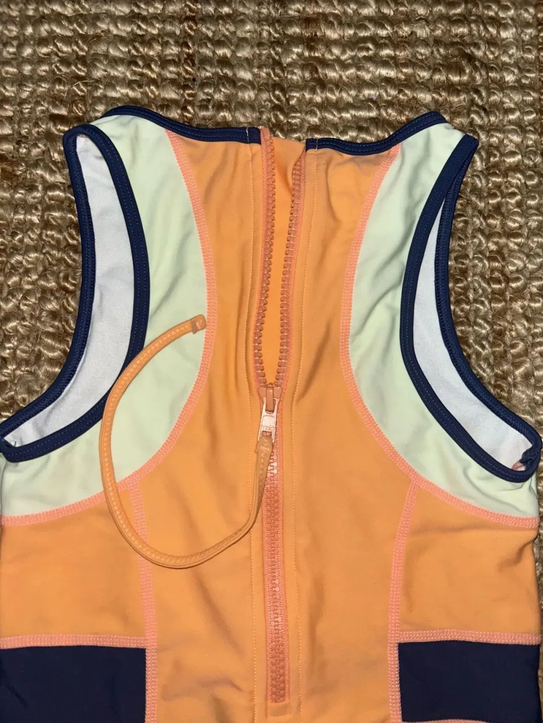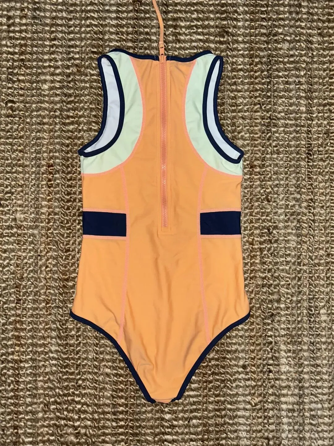 把泳衣翻到背面,依旧铺平,拉链位置放在画面中线,肩部两侧尽量对称,拍的时候可以完整带出背部,也可以稍微留一点地毯纹理,让背景把主体托住,