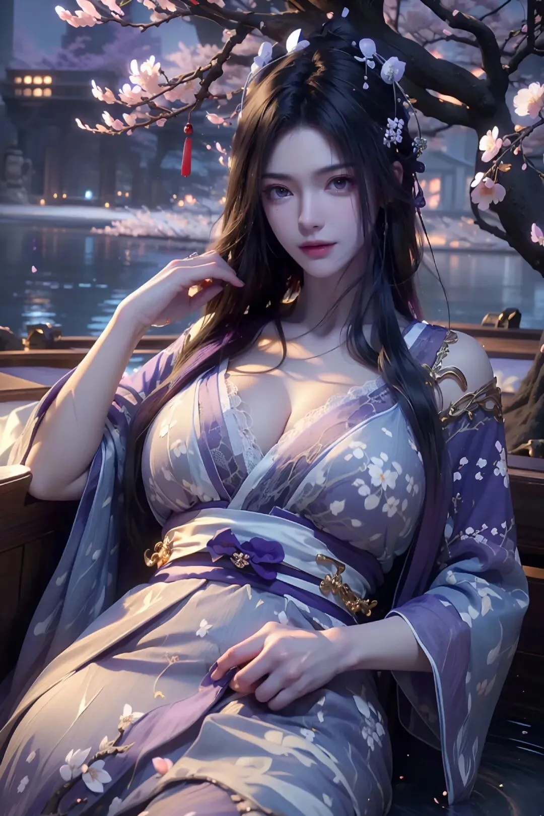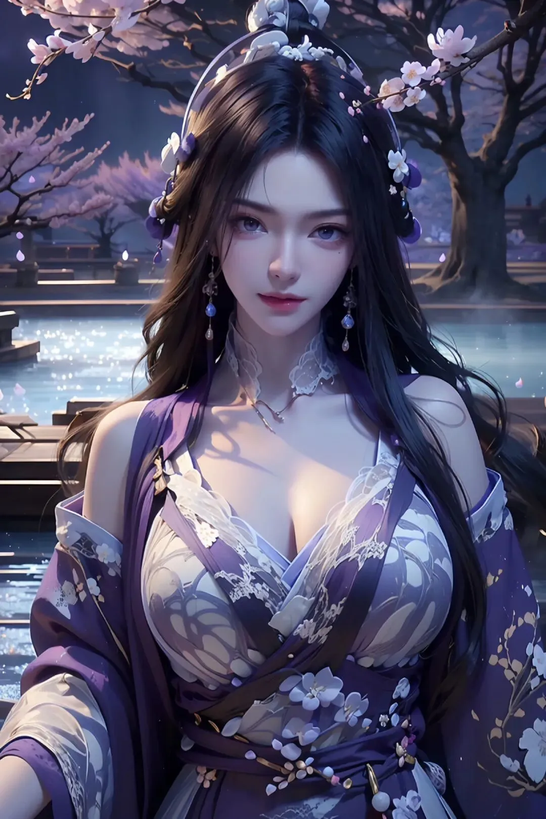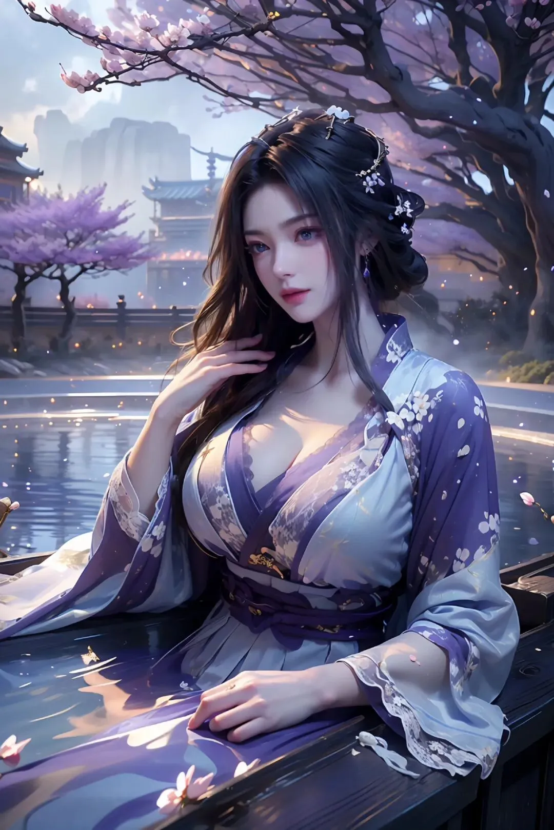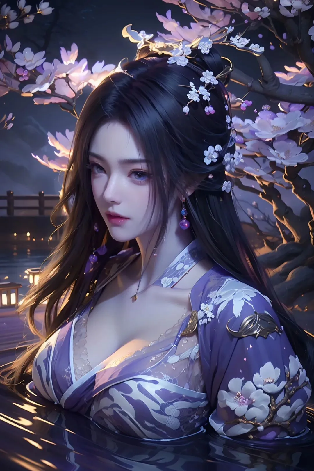 花树映寒潭,灵眸藏星河,一袭紫罗裙,绝色压尽芳华。