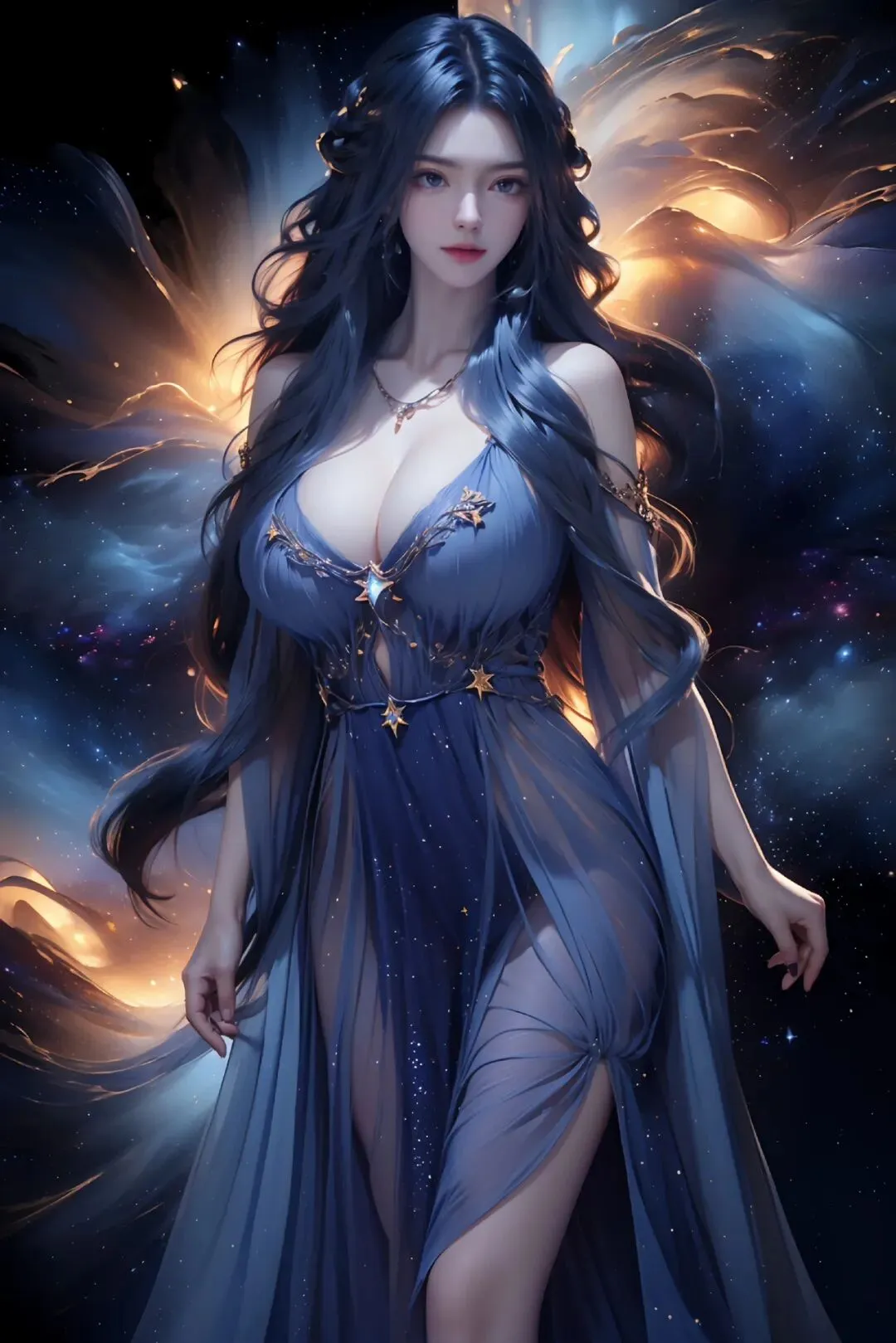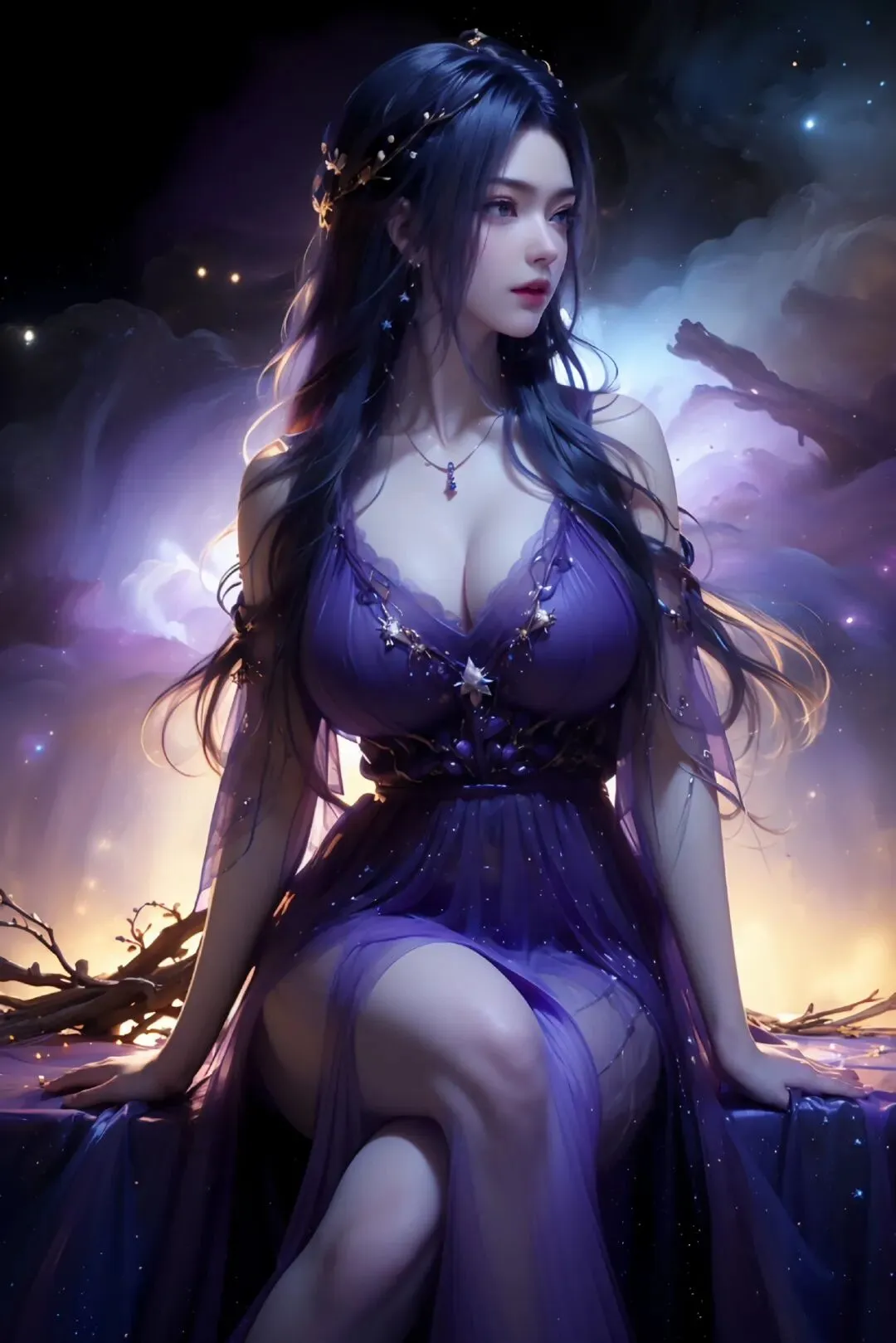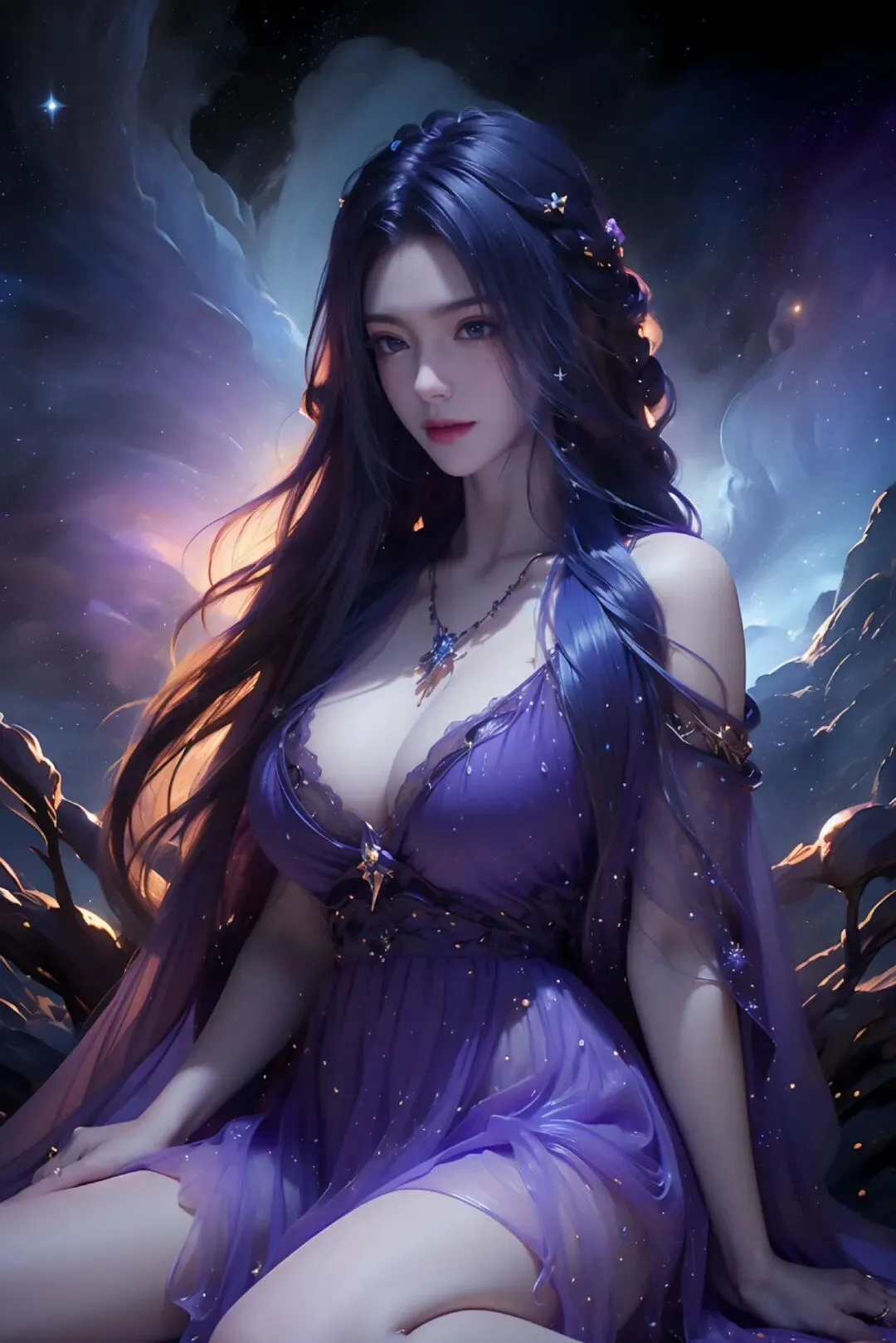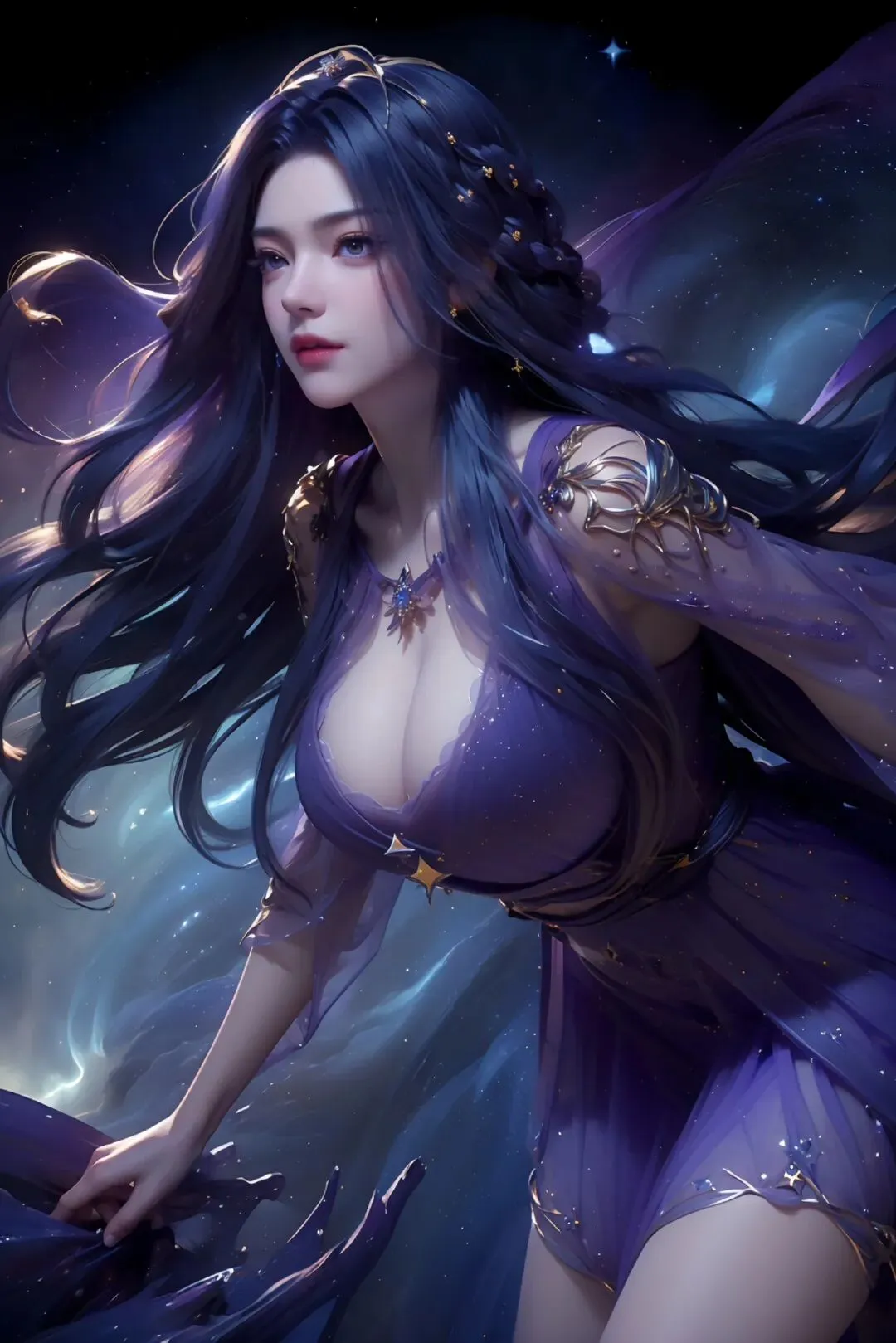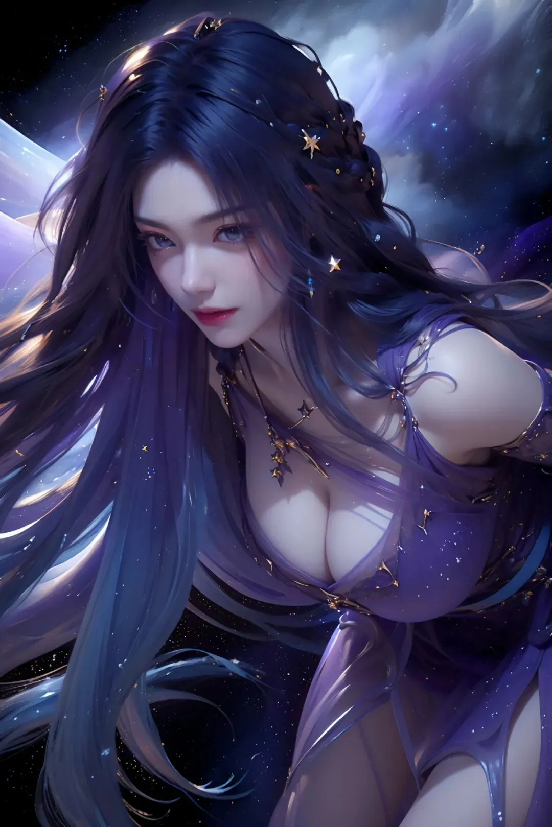 星河作背景,紫裳缀星辰,身姿如月华,绝色映洪荒。