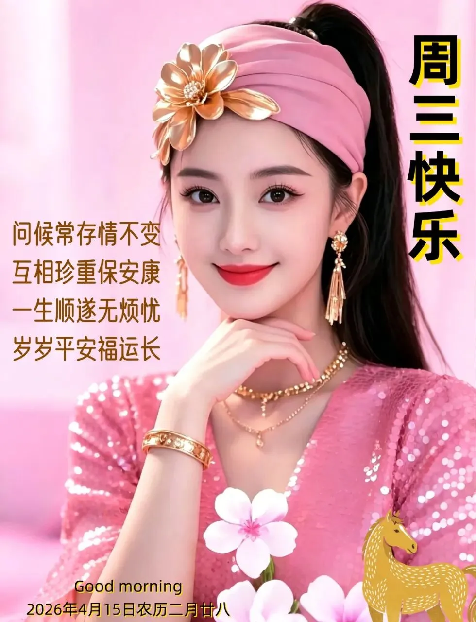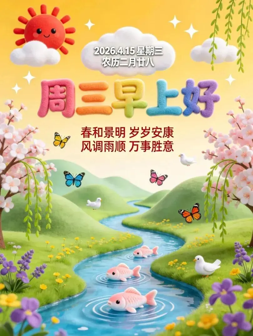 周三吉祥🏵️,微风送暖🍃。人生知足常乐😊,平安便是福气🧧,愿您作息规律身体健💪,心态平和笑容多😄,日子平淡也温馨🏡,万事顺遂🙏,安然喜乐🌸,岁岁都安康🌾。