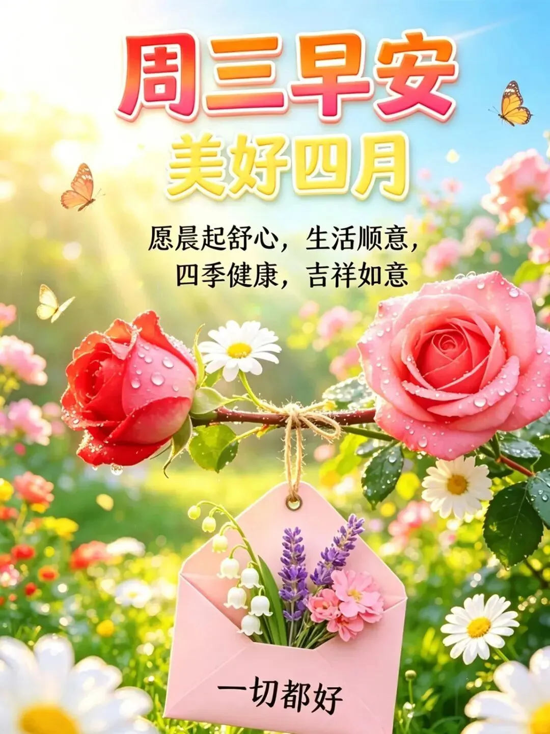 春天的美好🌸,藏在和煦微风里🍃;人生的精彩🎉,写在流转四季里🌿;真挚的牵挂💌,都在早安问候里☀️。愿平安常伴❤️,喜乐相随😄,周三清晨愉快🌅!