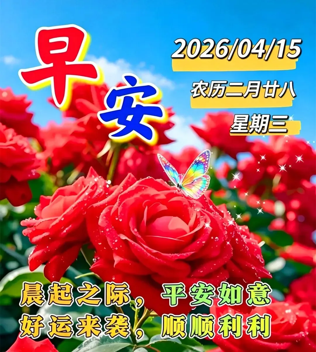 当前位置:首页>美女资讯>4月15日周三早安祝福图片:开心快乐每一天,安康幸福好运来!周三快乐!