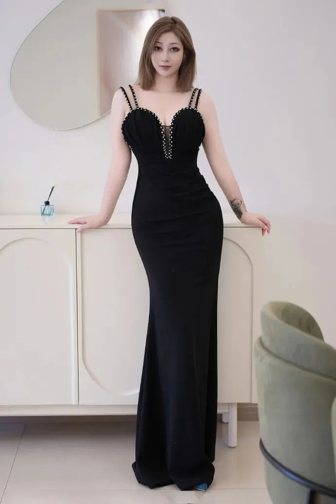 黑色深V吊带长裙,酥胸若隐若现,甚是迷人。▼