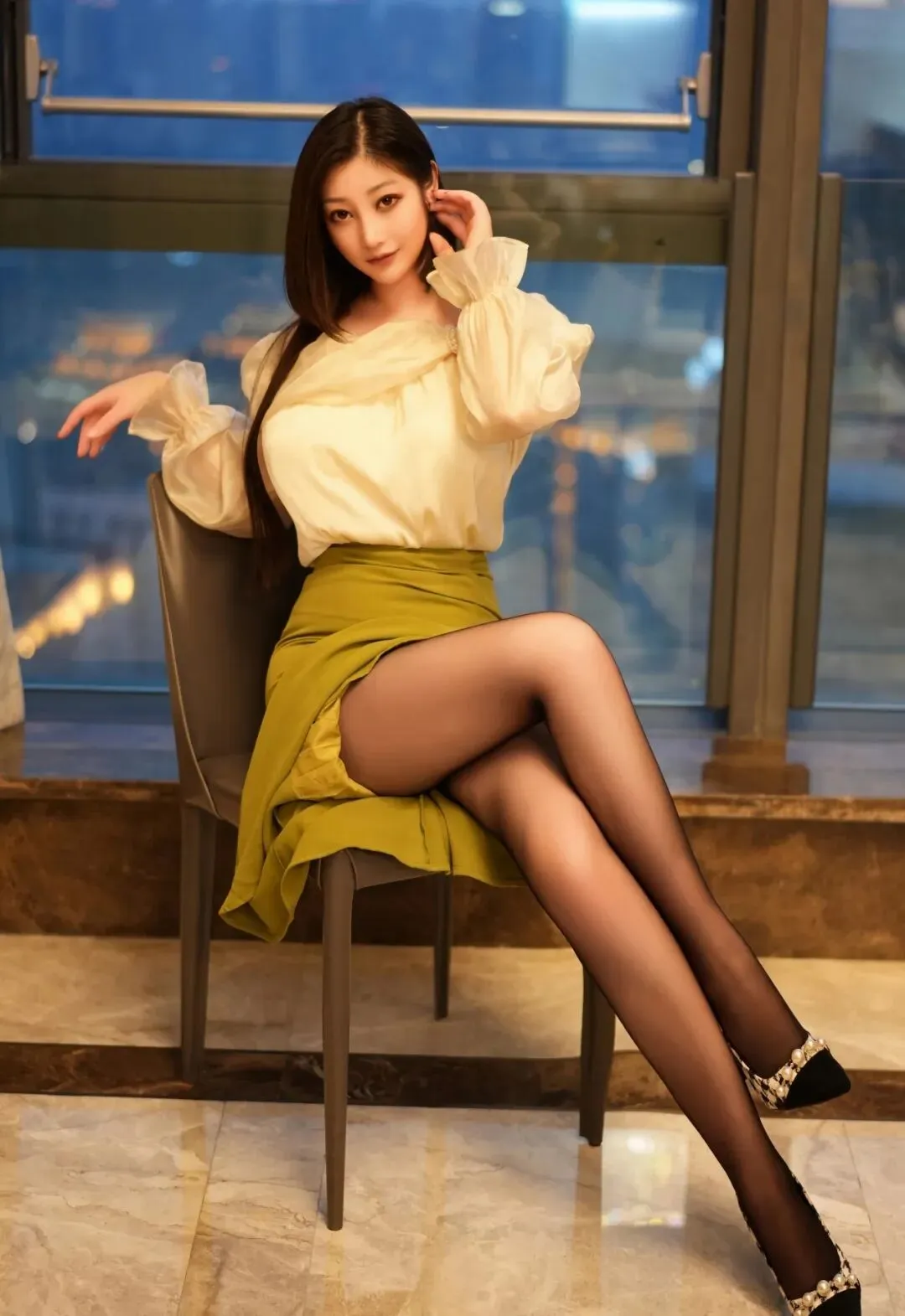 米白色翻领衬衫,下搭墨绿色高腰开叉包臀短裙,黑色丝袜搭配带蝴蝶结装饰的白色高跟鞋,丝袜修饰腿部线条,蝴蝶结元素为整体增添了几分甜美精致。▼