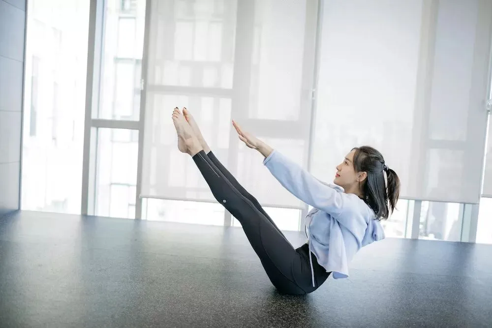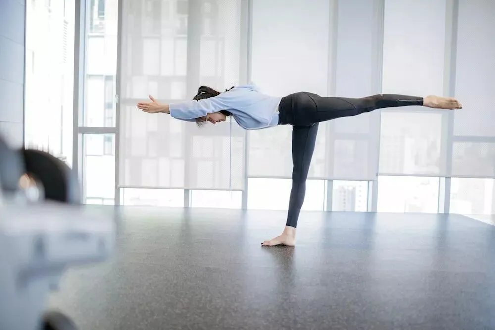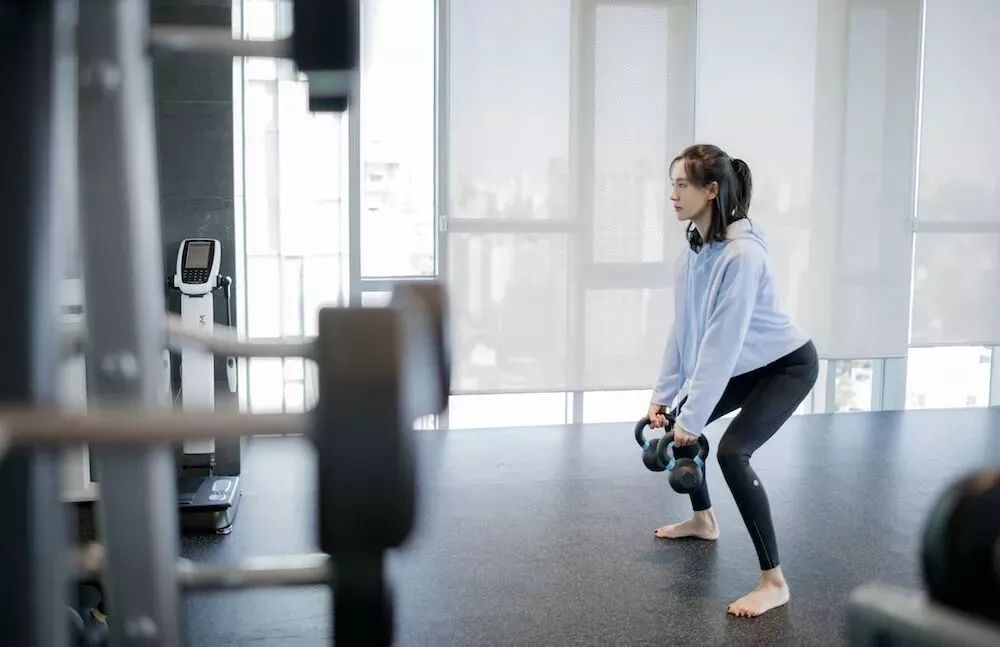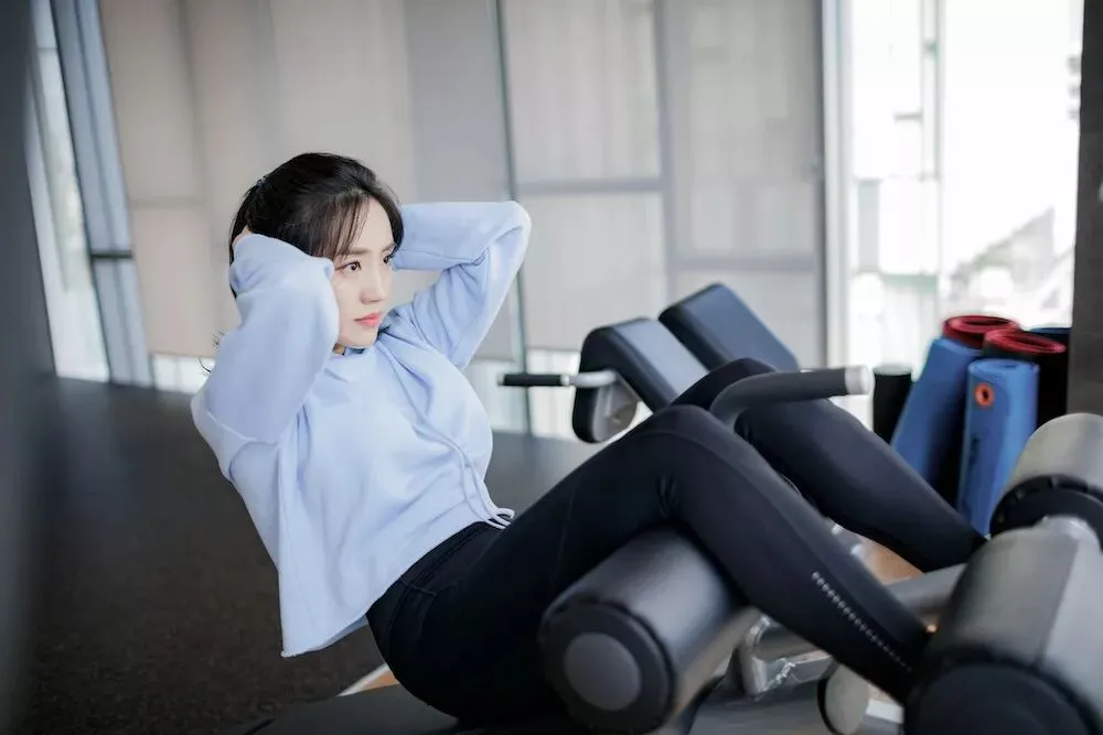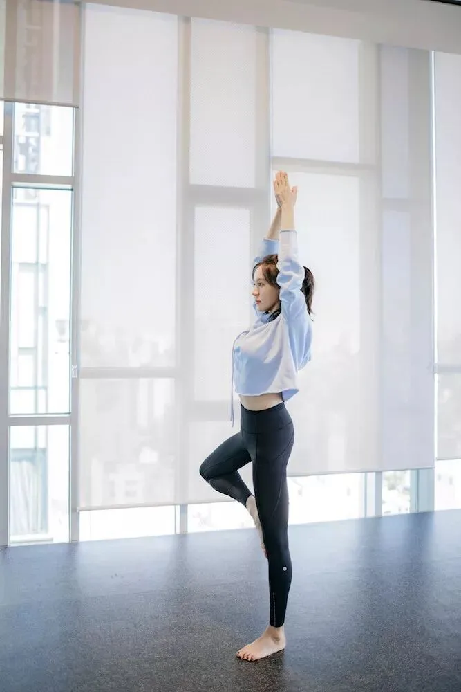 一身宽松浅蓝运动衫搭配黑色紧身裤