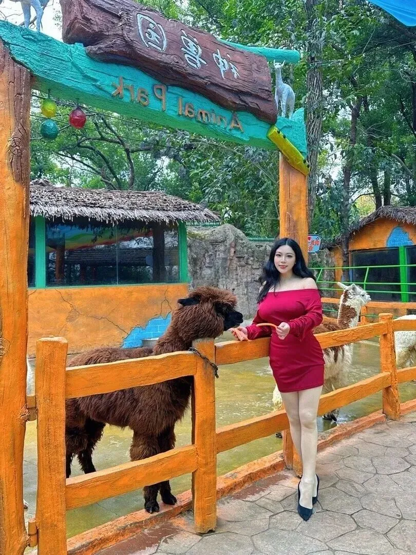 转到羊驼园的时候,同样的裙摆却有不同的音色。她穿上一双细高跟鞋之后就立刻变成了一个精致的小公主。酒红色同羊驼那件毛茸茸的暖色混在一起,画面活灵活现在童话里抠出来一样。我最欣赏的就是她弯腰去摸羊驼的时候,裙子一点都没有被弄皱,反而更显得她身体的曲线更加优美。露肩的设计在阳光照耀之下产生的是细碎的光线,是成熟而带有几分调皮气息的美,实在是太巧妙了。